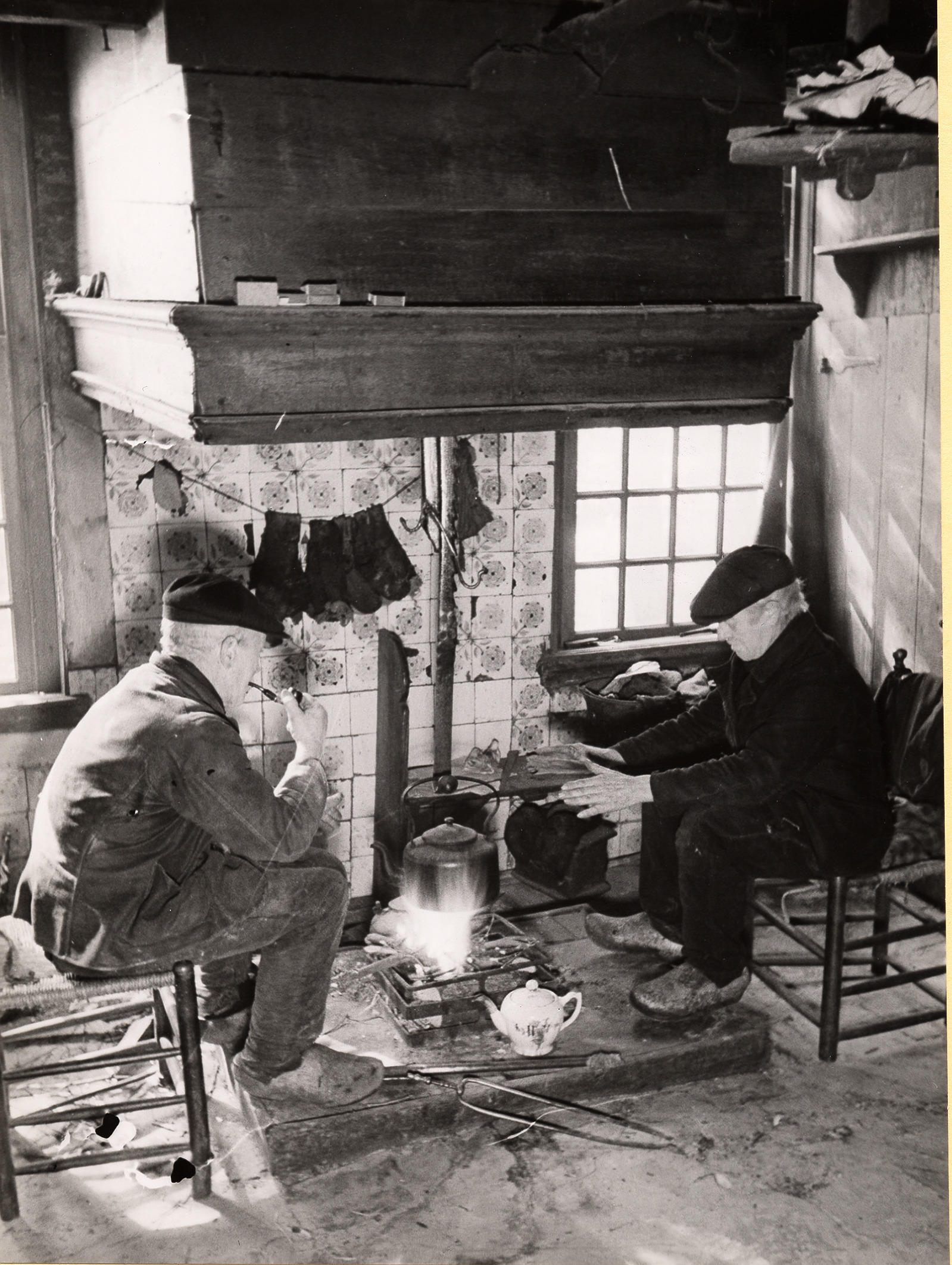 Gebroeders Van Spil bij het open vuur, Rouveen, 1944 (zwart-wit foto)