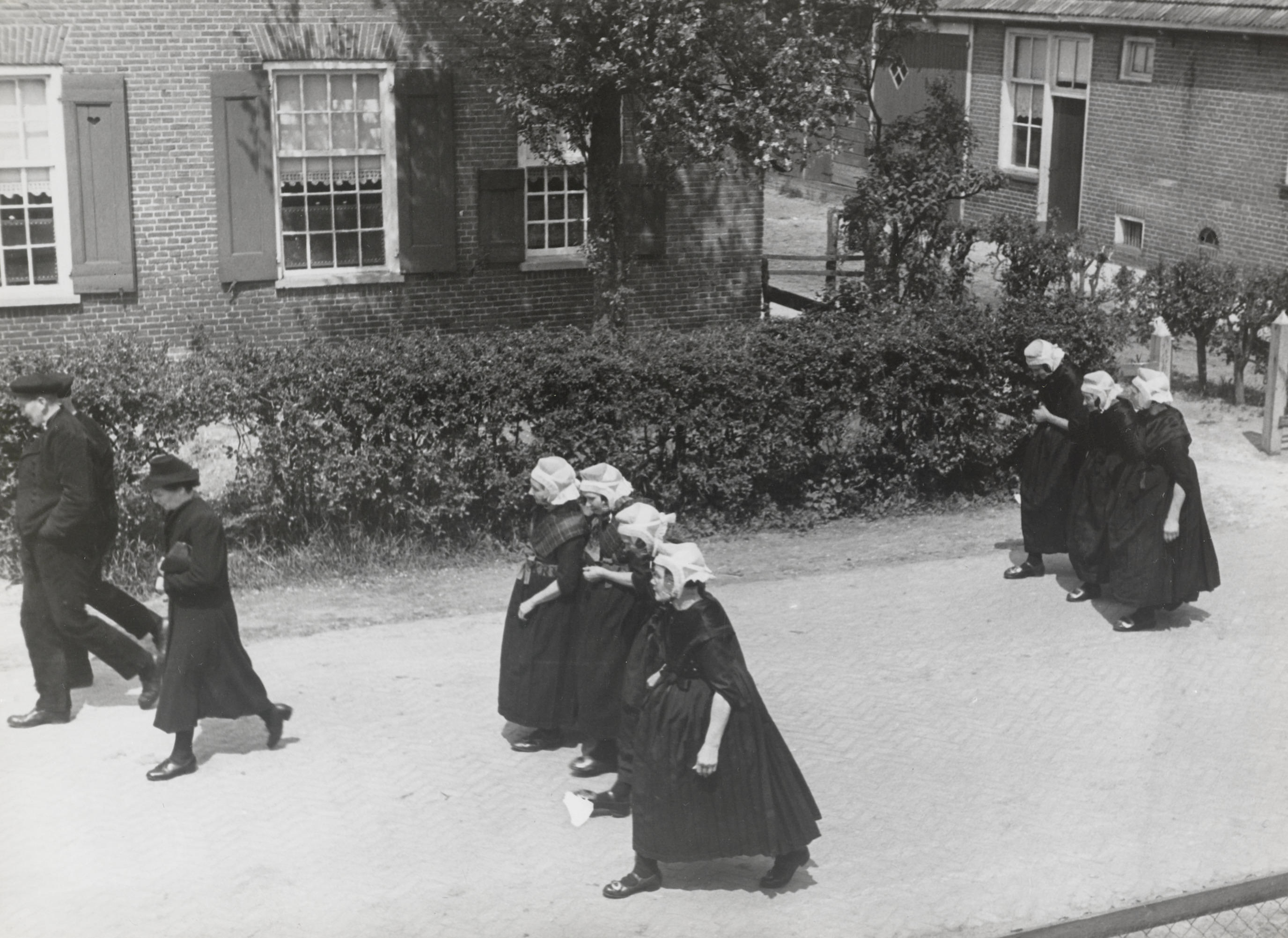 Mannen en vrouwen in zondagse kerkdracht keren terug van de kerk in Staphorst.