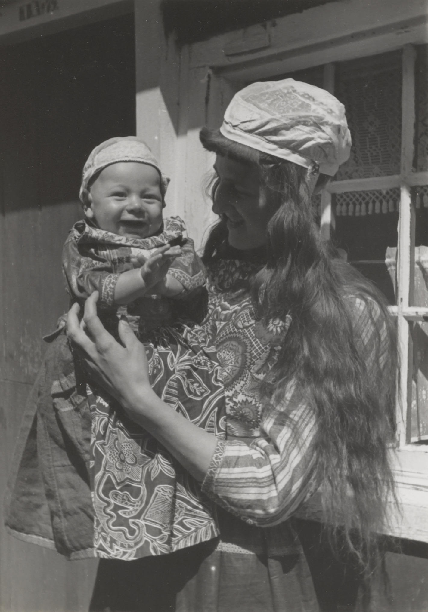 Maretje Moenis-Kes en zoon in Marker dracht, 1944 (zwart-wit foto)