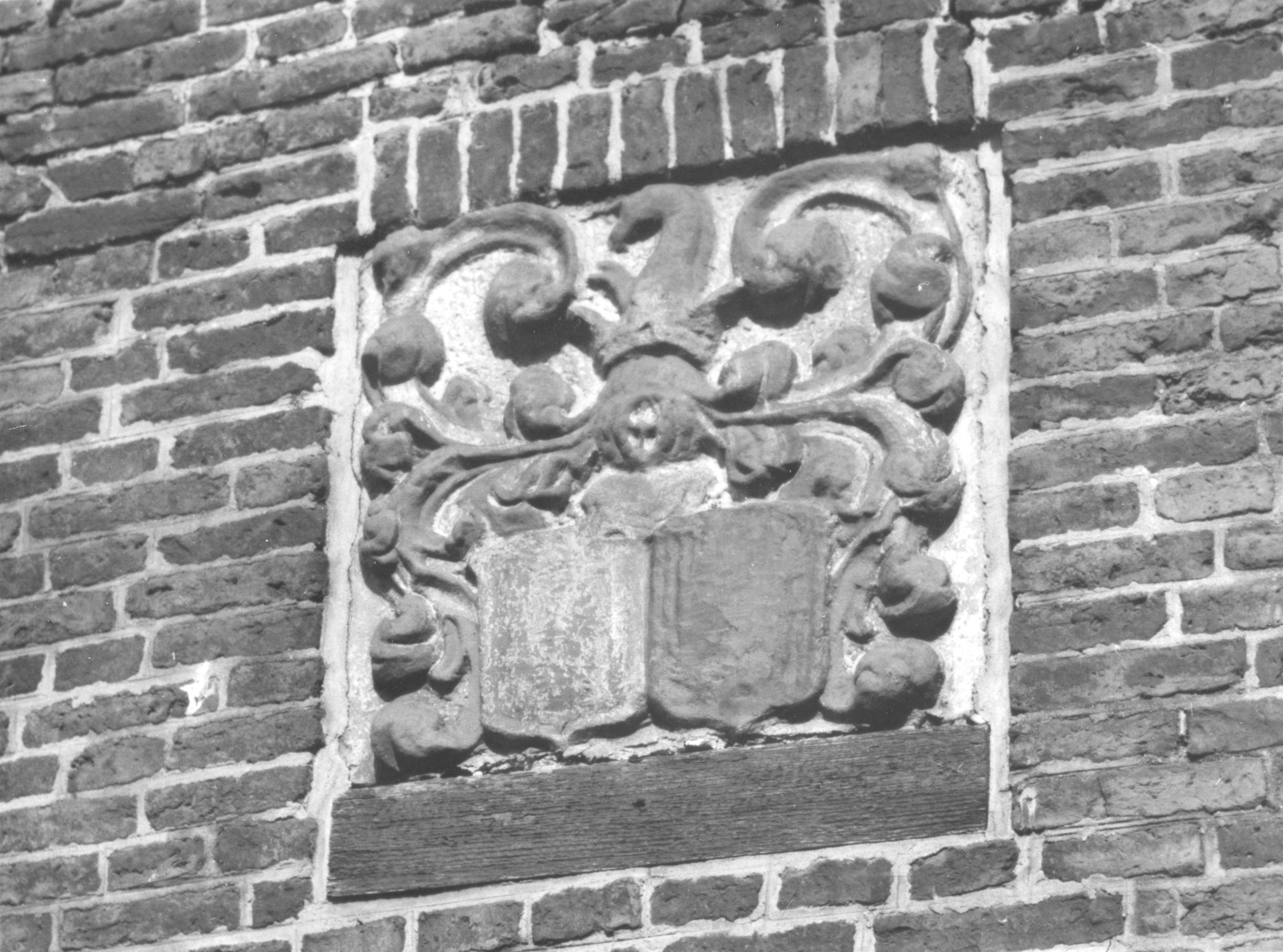 Gevelsteen met familiewapens, Anjum, 1944 (zwart-wit foto)