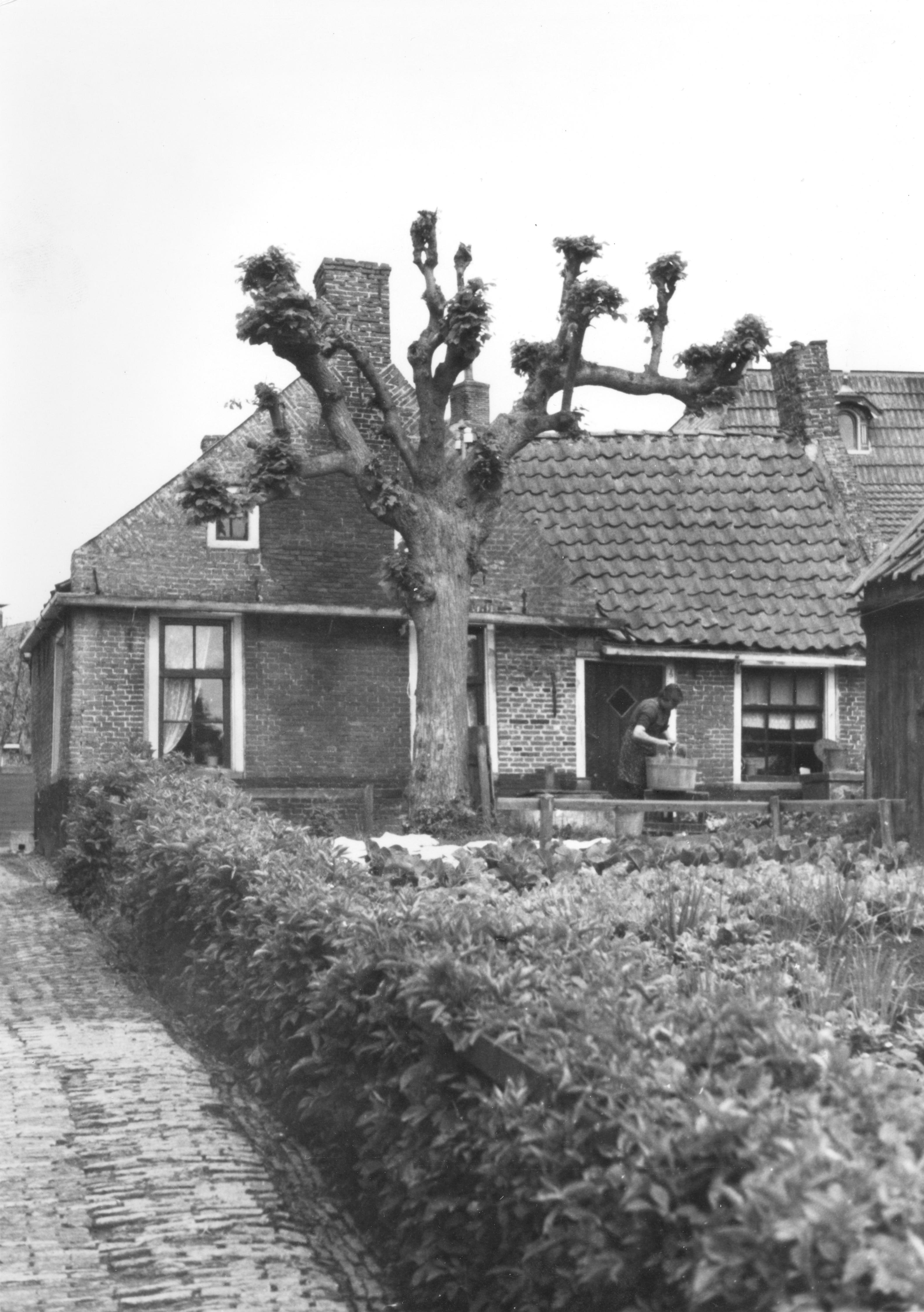 Arbeiderswoning in Anjum. Naast de woning staat een leiboom. Op het erf is een vrouw bezig met de was.