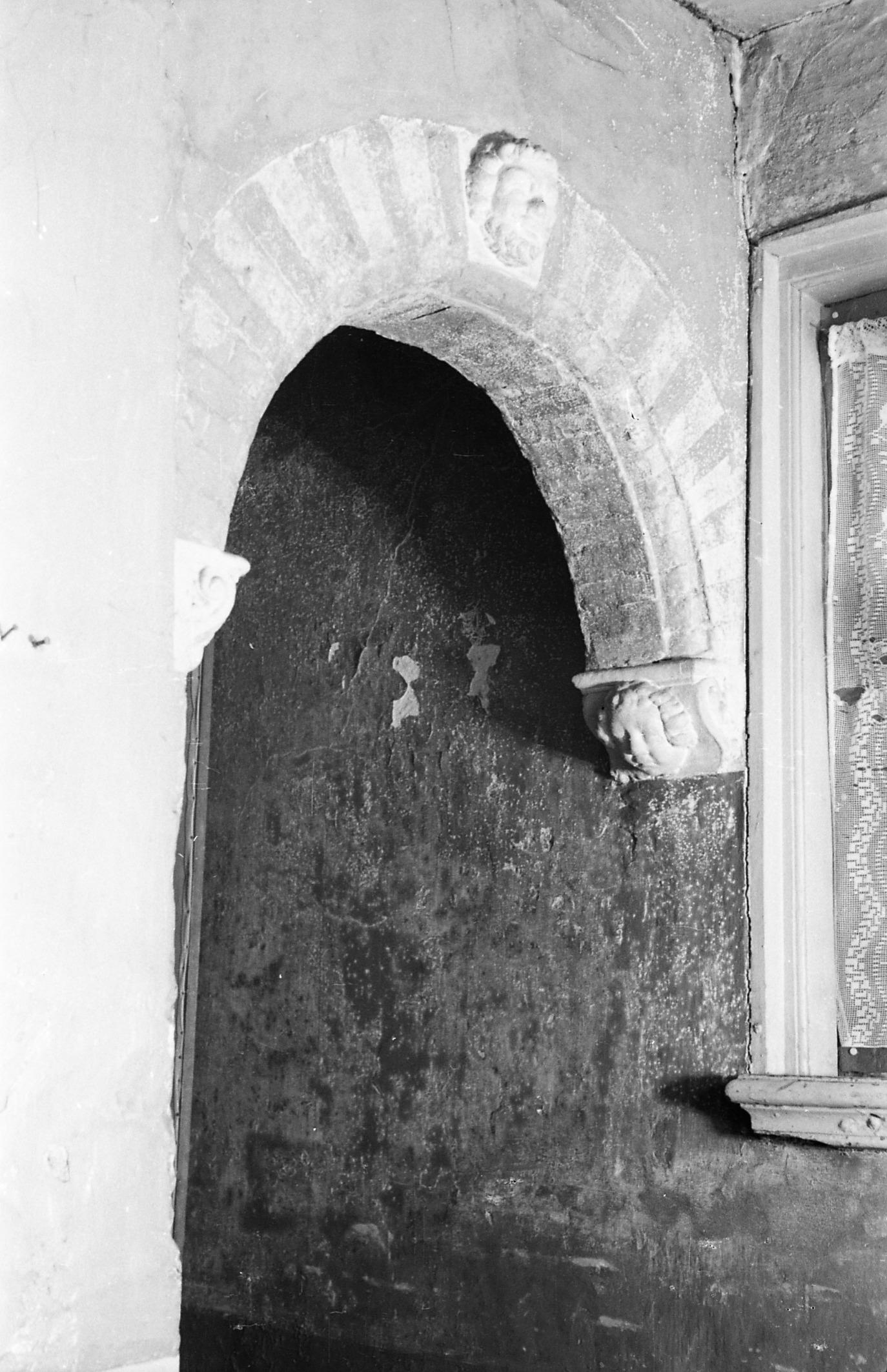 Gemetselde boog met drie sluitstenen waarop kopjes zijn aangebracht in een gebouw in Workum.