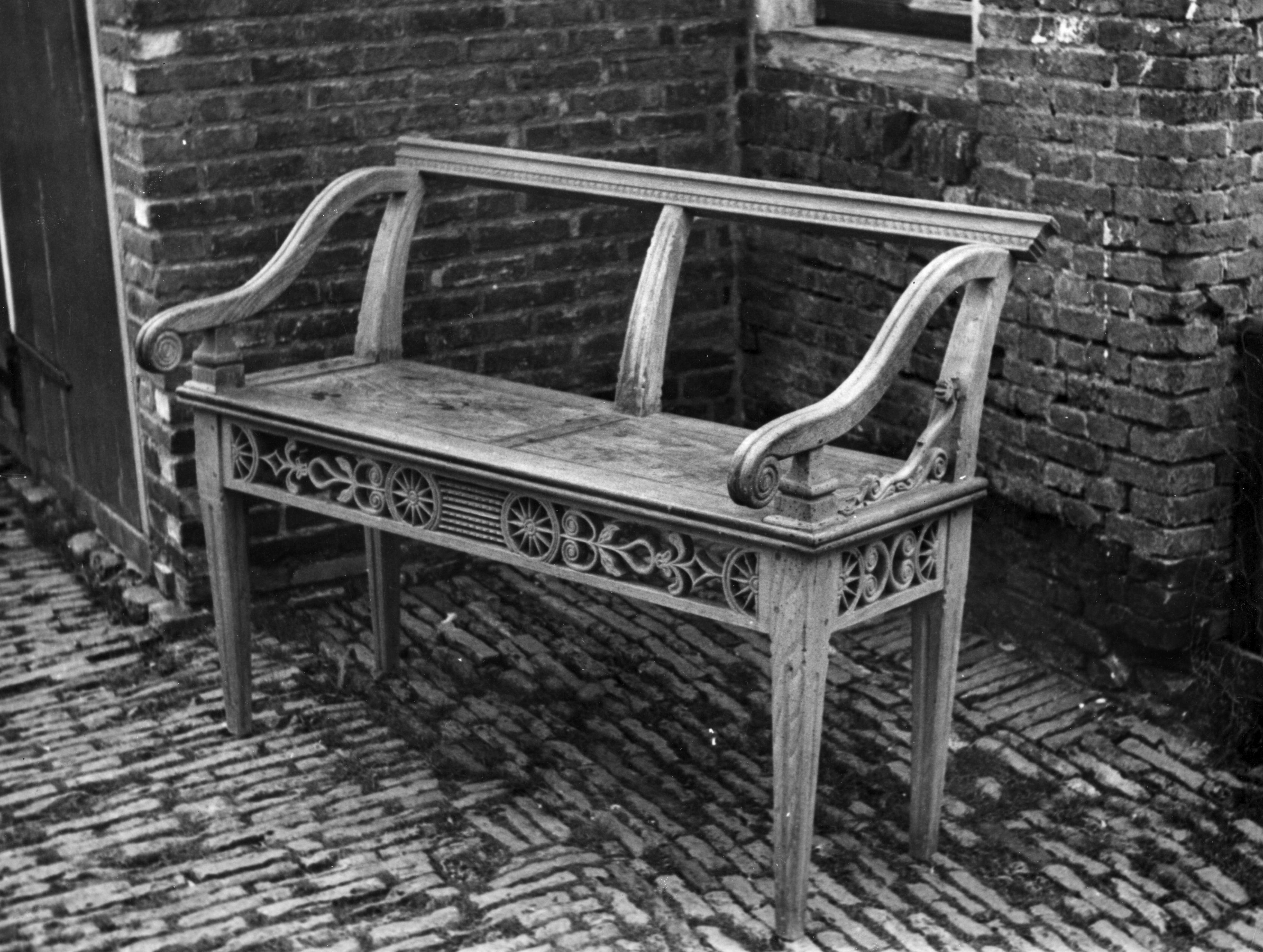 Bankje met houtsnijwerk, Workum, 1944 (zwart-wit foto)