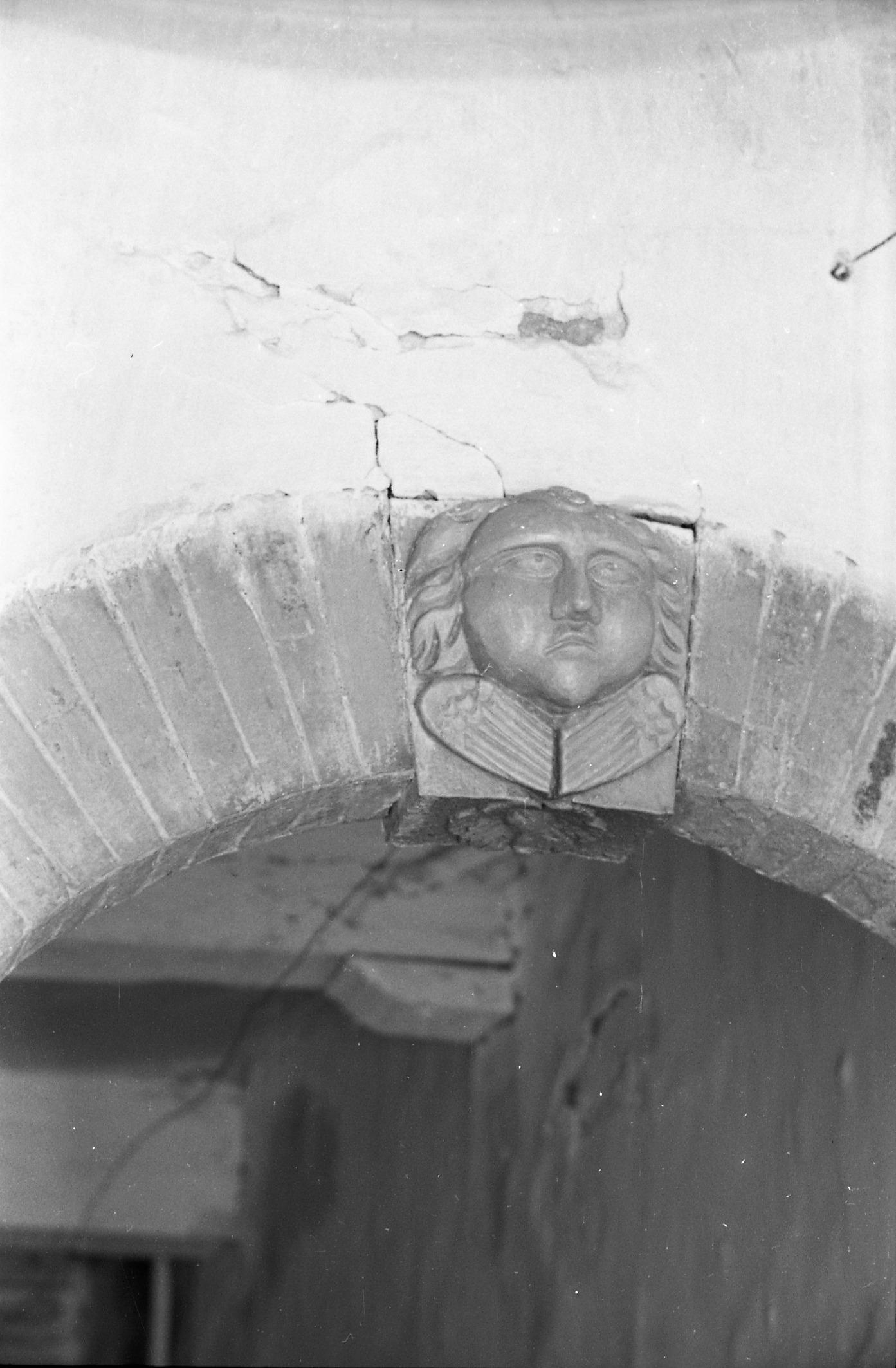 Sluitsteen met een engelkopje in een gemetselde boog in Workum.