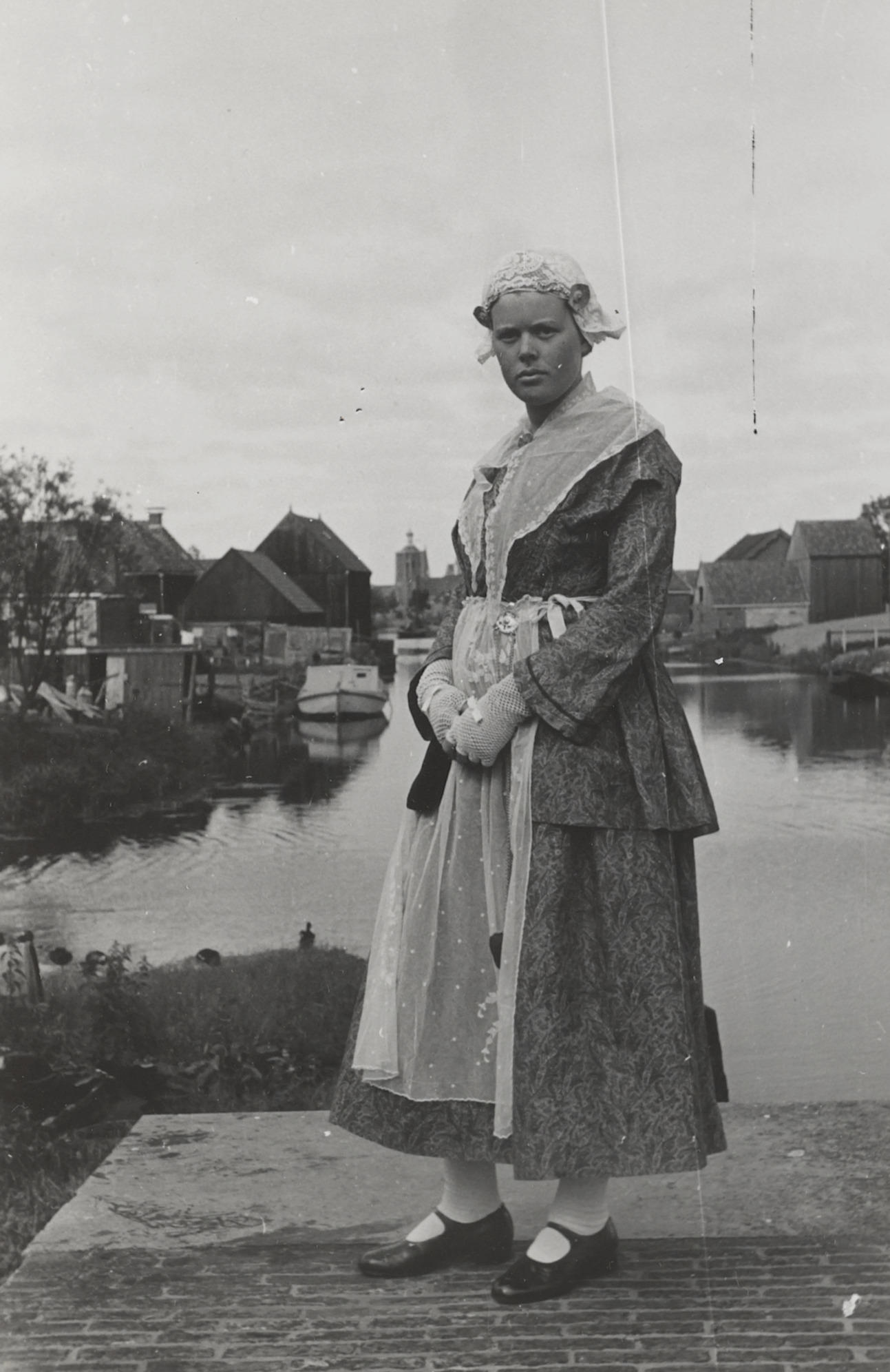 Vrouw uit Workum, verkleed in Friese dracht, 1944 (zwart-wit foto)