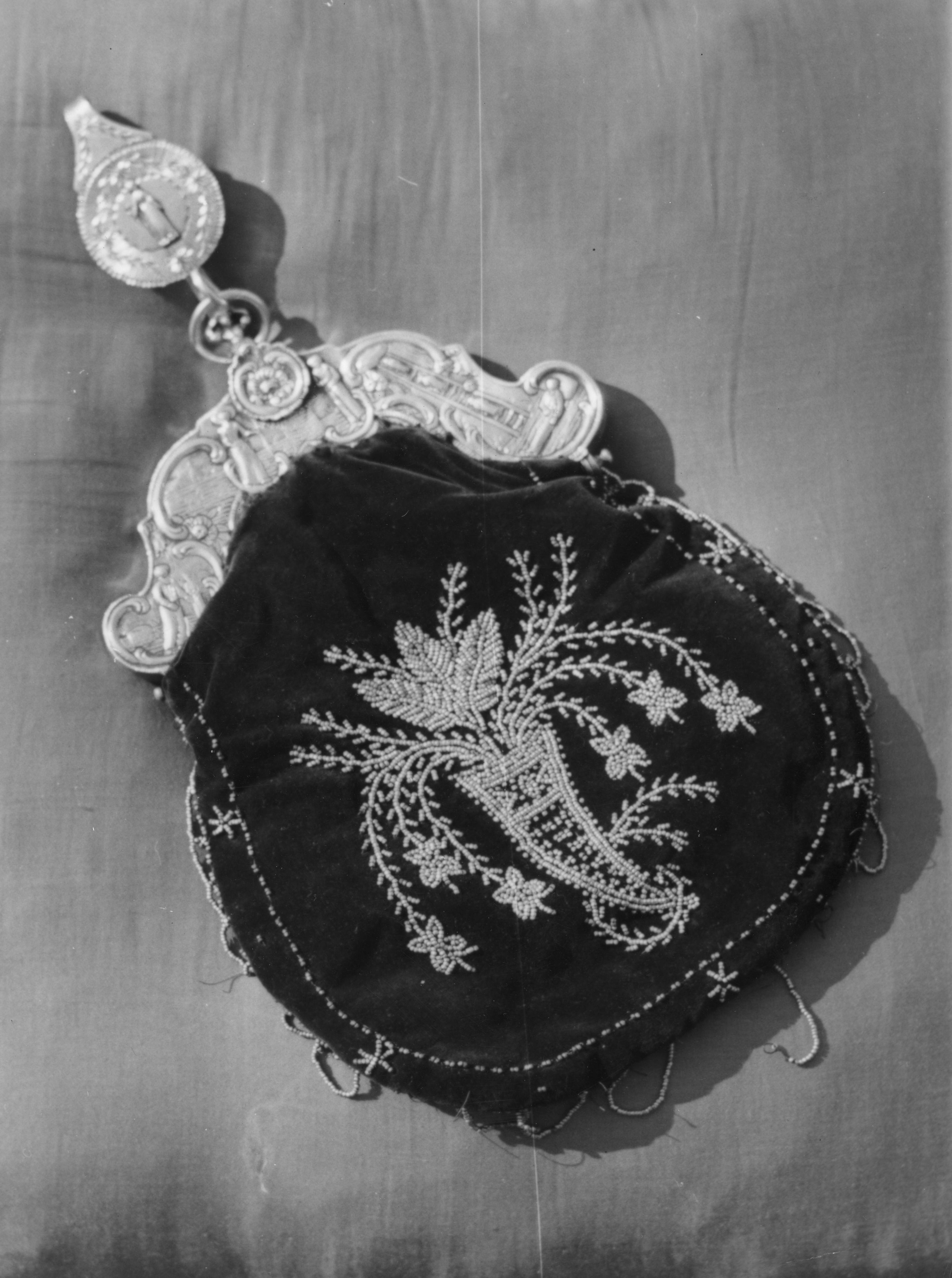 Beugeltas, met een zilveren haak en tasbeugel en een fluwelen tas met kralenborduurwerk, uit Workum.