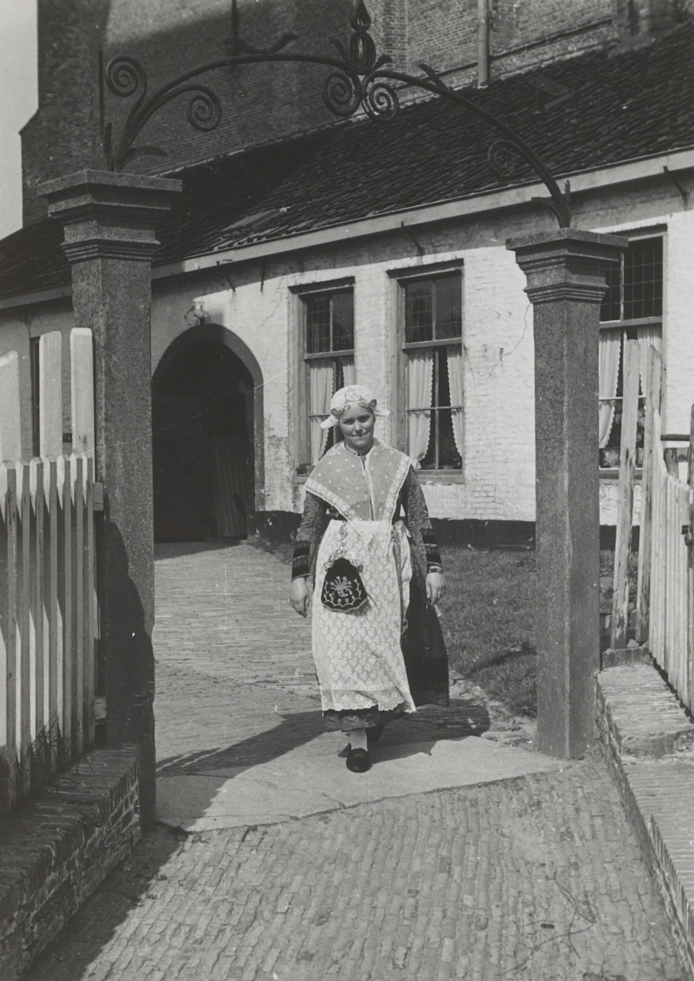Vrouw uit Workum, verkleed in Friese dracht, 1944 (zwart-wit foto)
