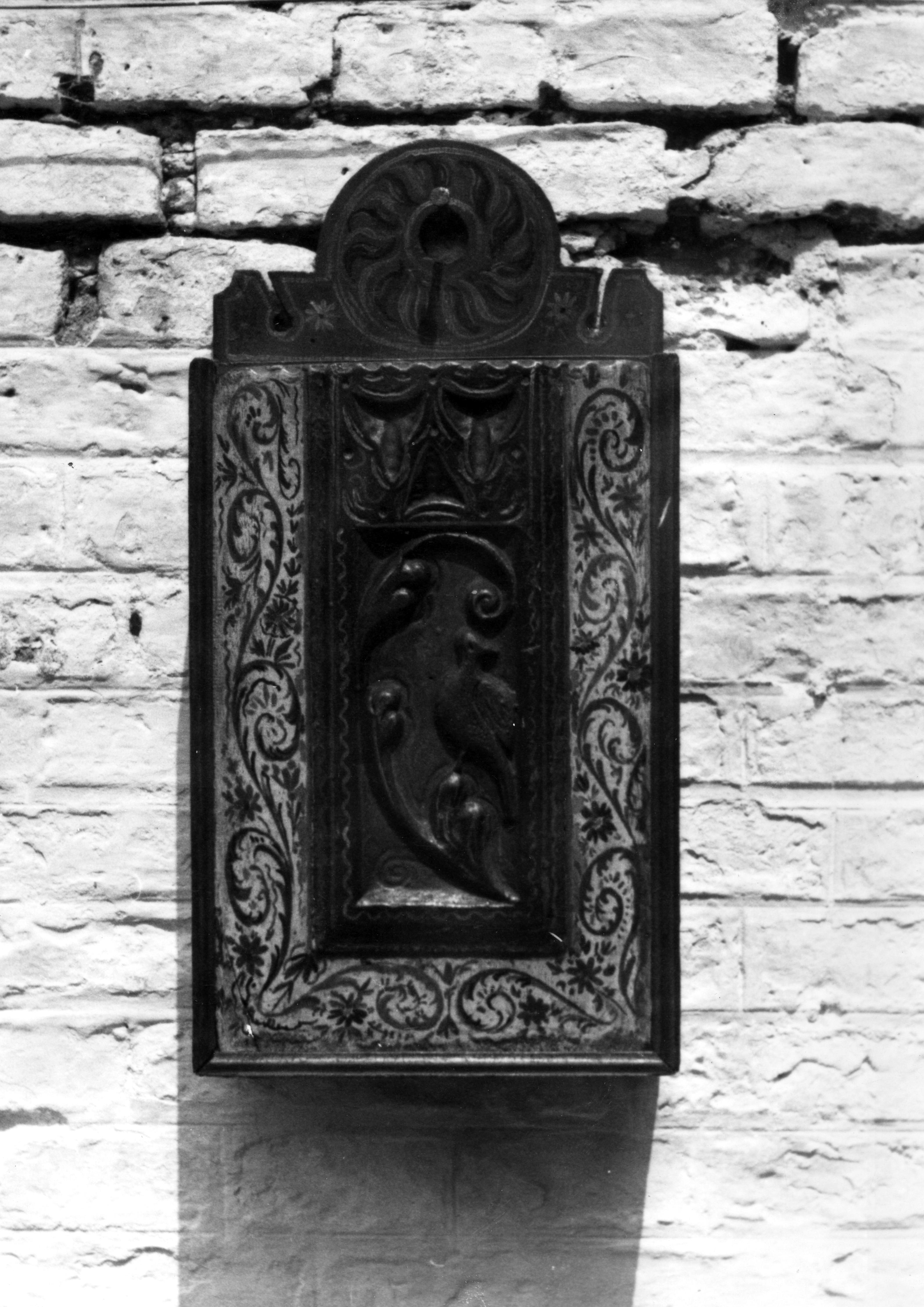 Beschilderd houten schooltas uit Workum, 1944 (zwart-wit foto)