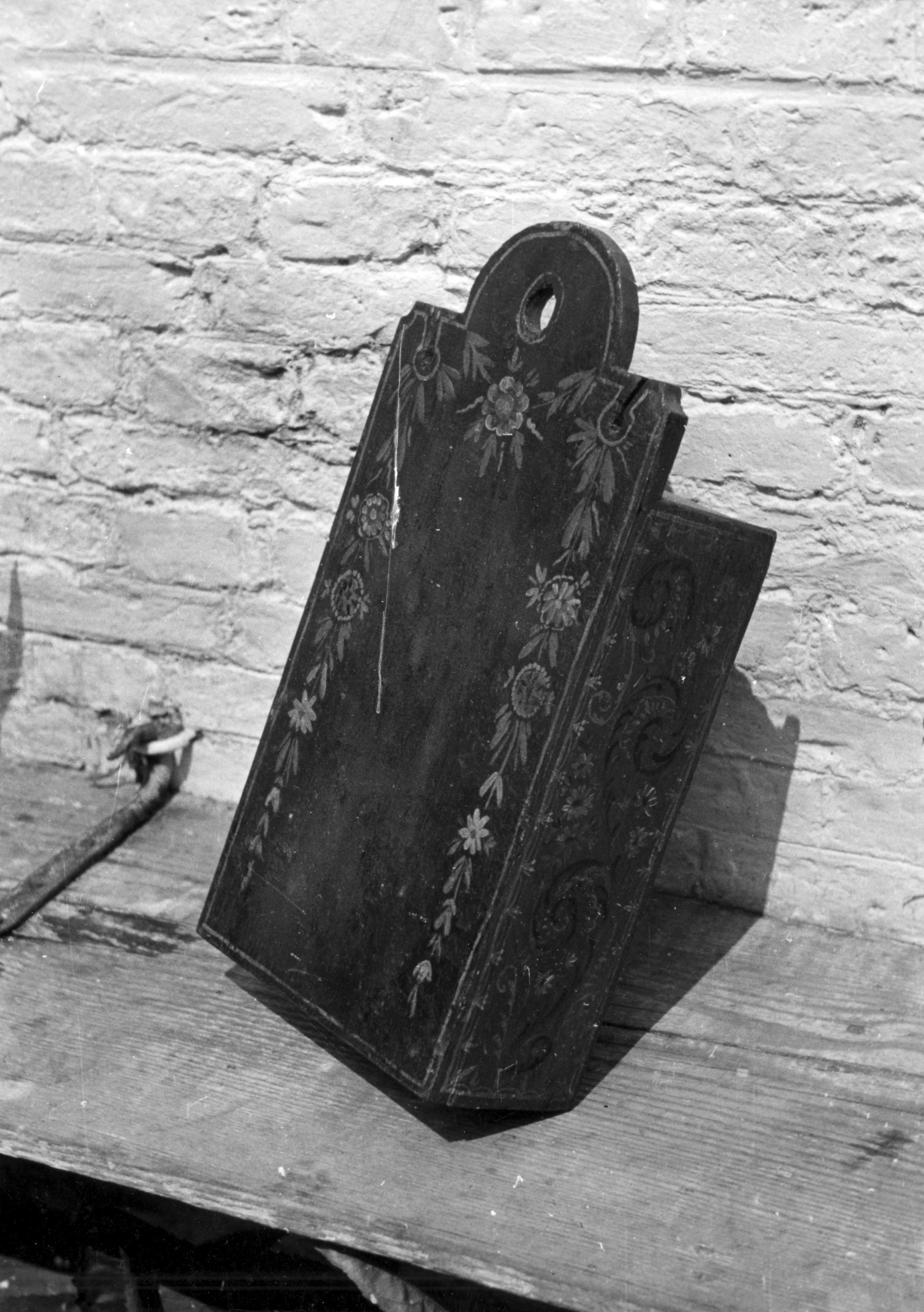 Beschilderd houten schooltas uit Workum, 1944 (zwart-wit foto)
