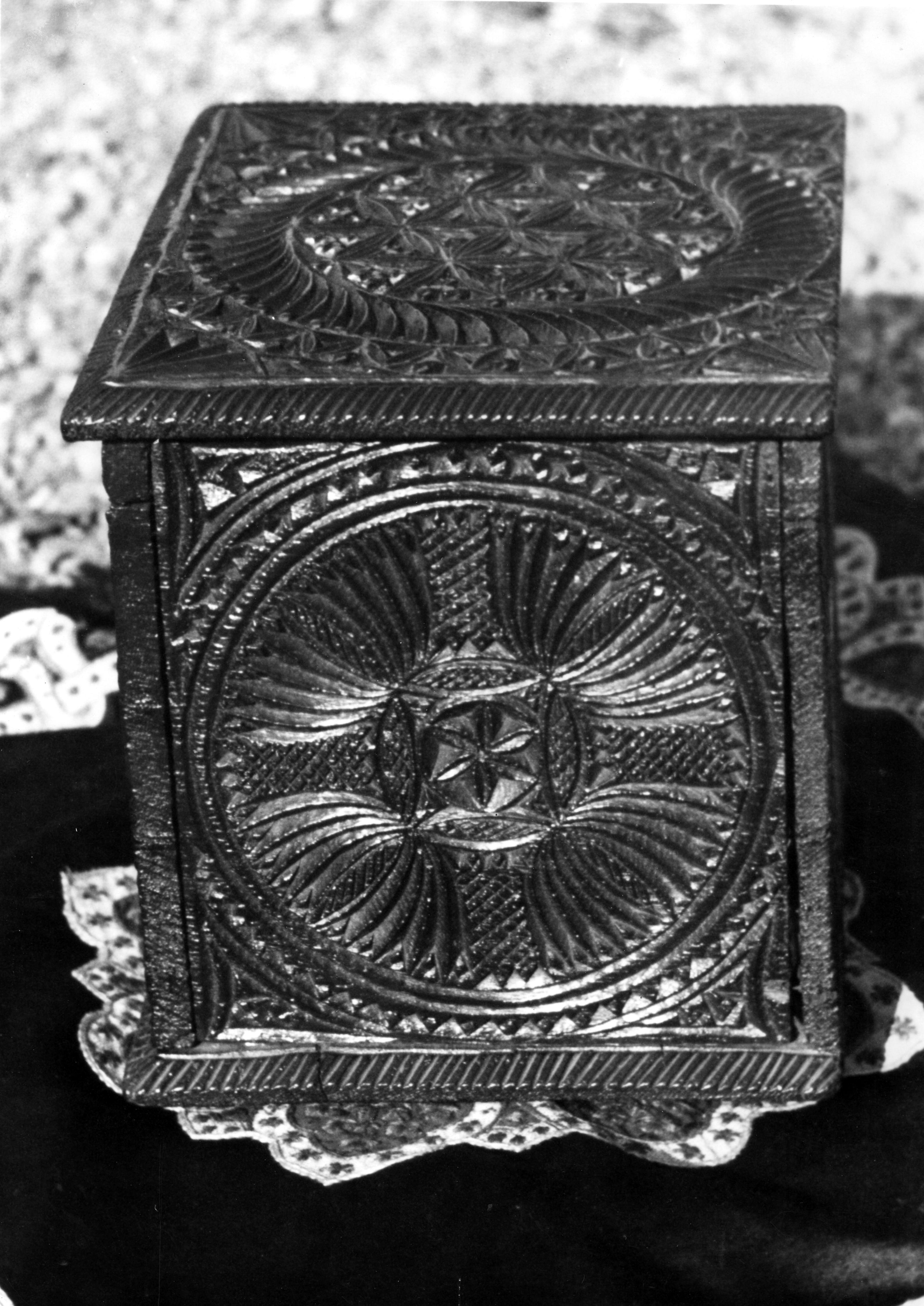Kistje met kerfsnedewerk uit Workum, 1944 (zwart-wit foto)