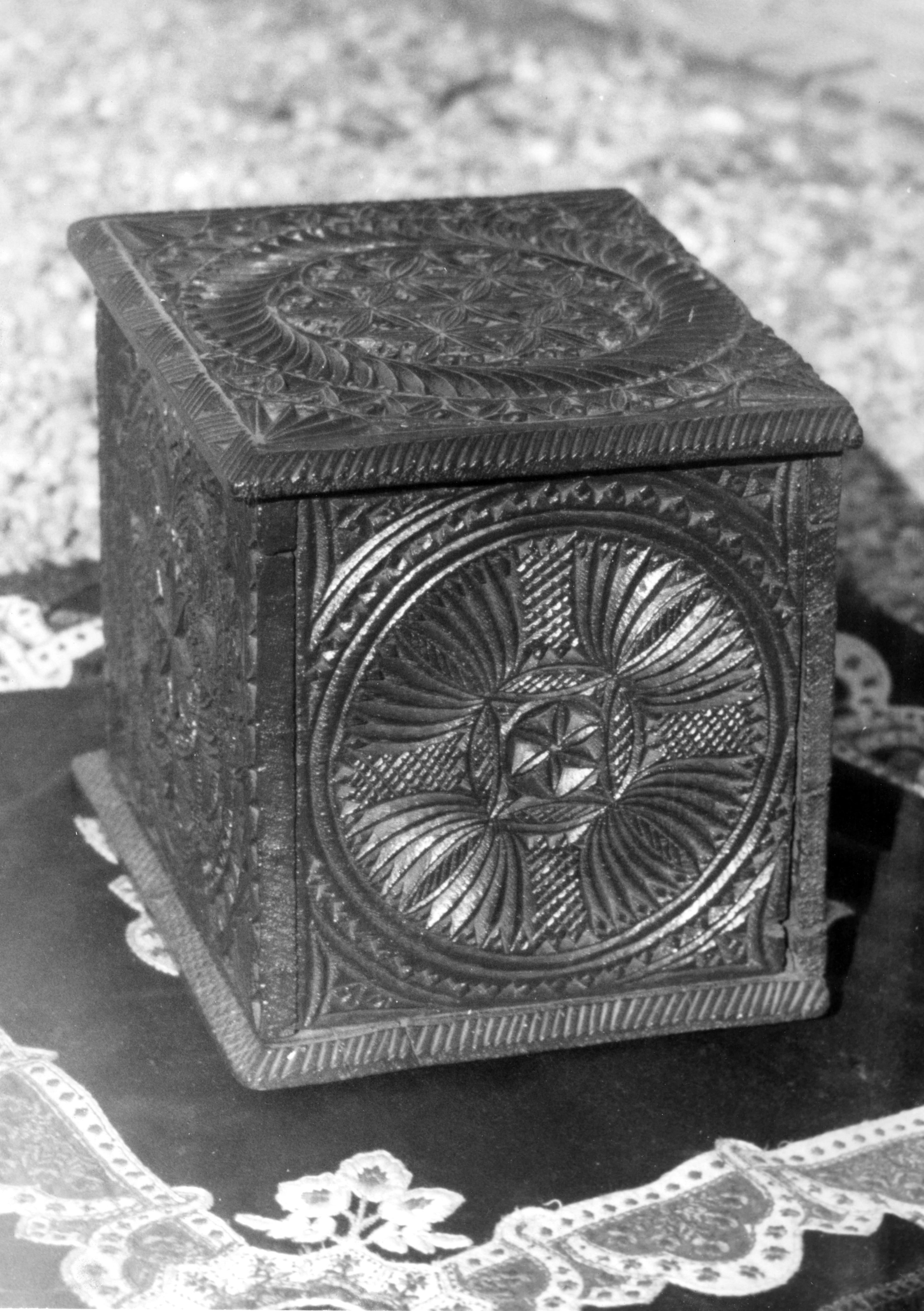Kistje met kerfsnedewerk uit Workum, 1944 (zwart-wit foto)