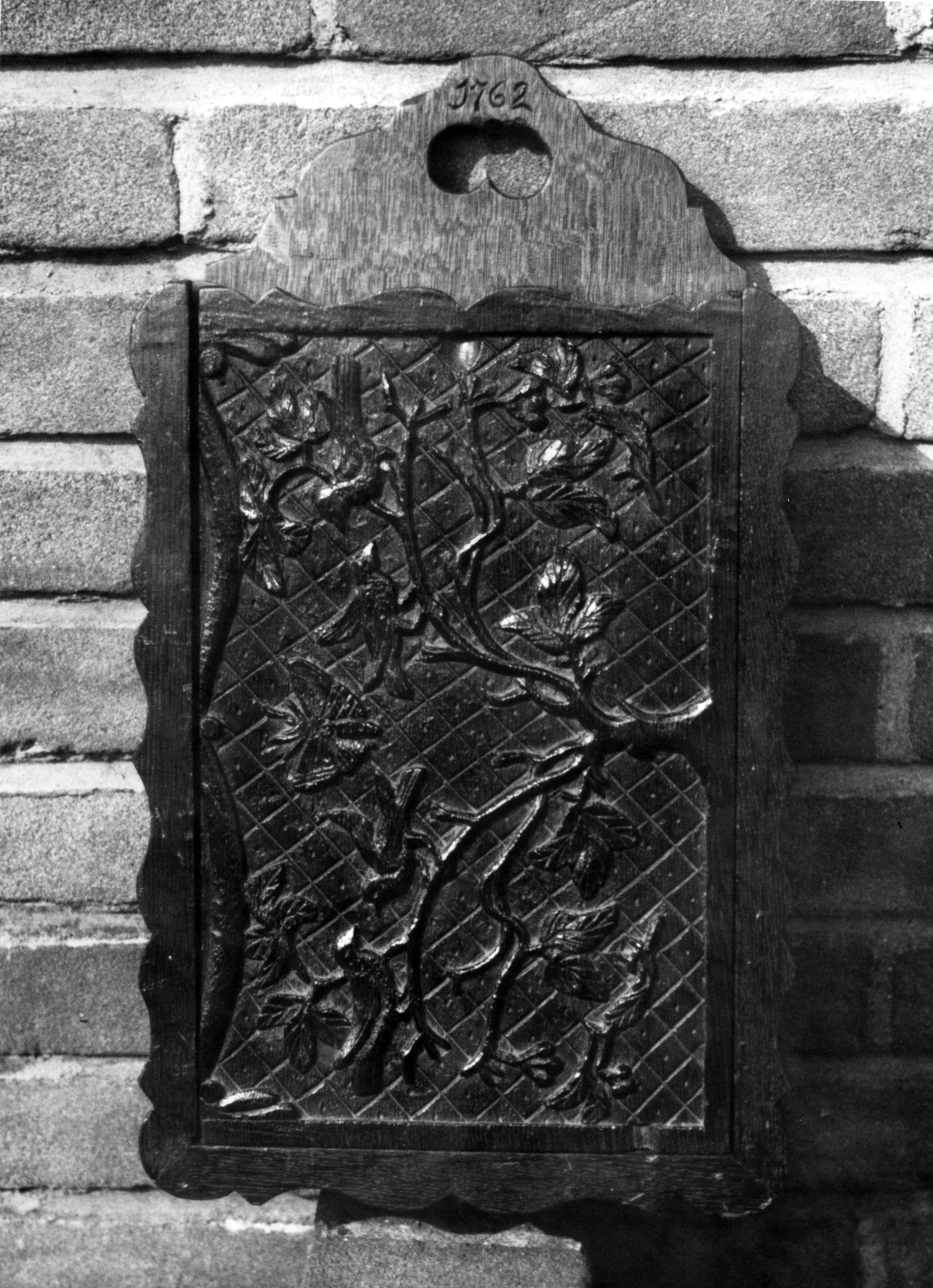 Houten schooltas, zogenoemd 'schoolbord', met het jaartal 1762. De schuif van de schooltas is voorzien van later aangebracht houtsnijwerk. De schooltas is eigendom van een familie in Workum.