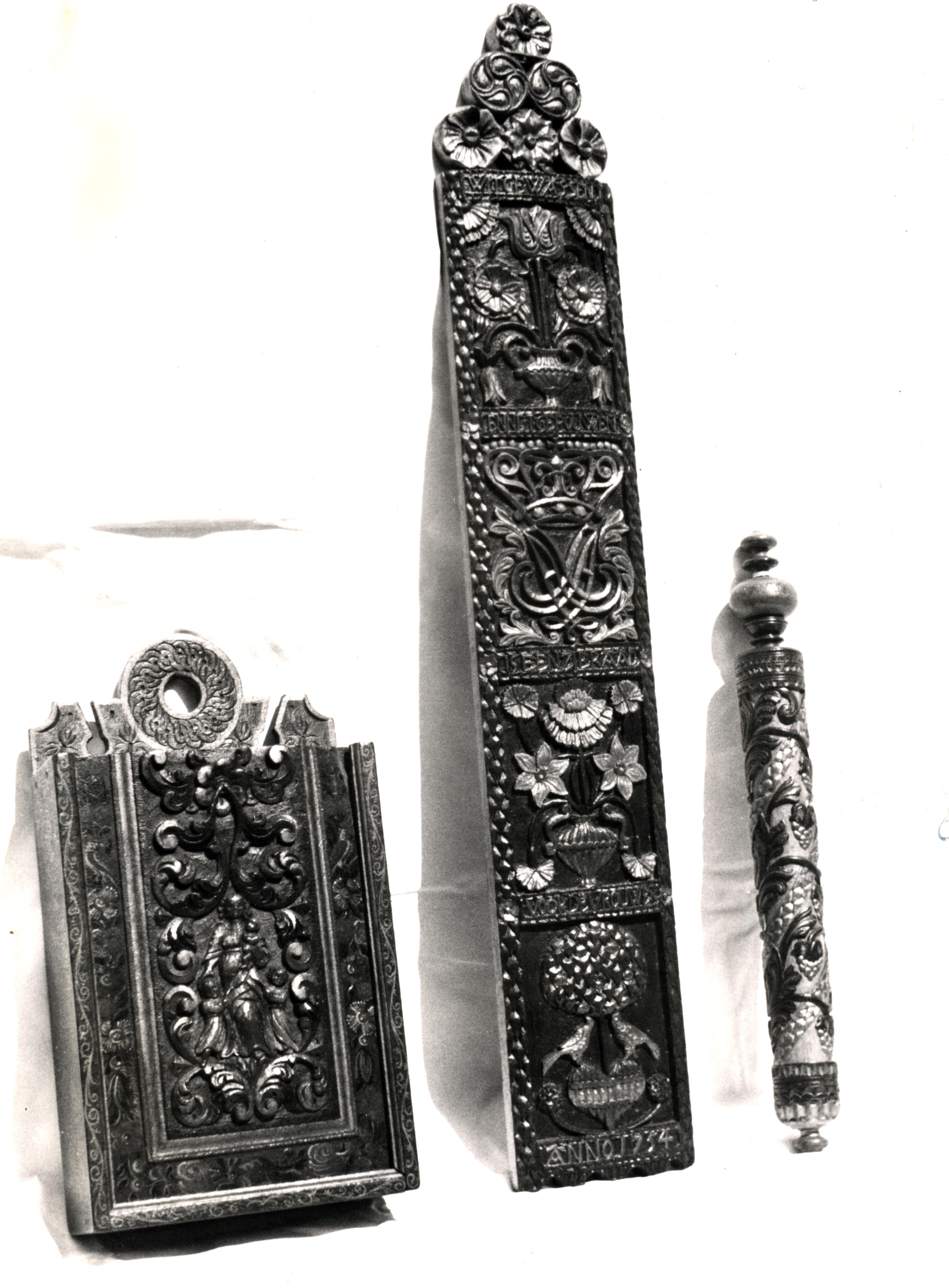 Houten schooltas, mangelplank en rol. De voorwerpen zijn versierd met houtsnijwerk en meerkleurig beschilderd. Op de mangelplank staat de tekst: 'WIT GEWASSEN EN NET GEVOUWEN IS EEN ZIERAAD VOOR DE VROUWEN ANNO 1754'. Oorspronkelijk zijn de objecten uit Hindeloopen afkomstig. Ze zijn eigendom van een familie in Workum.
