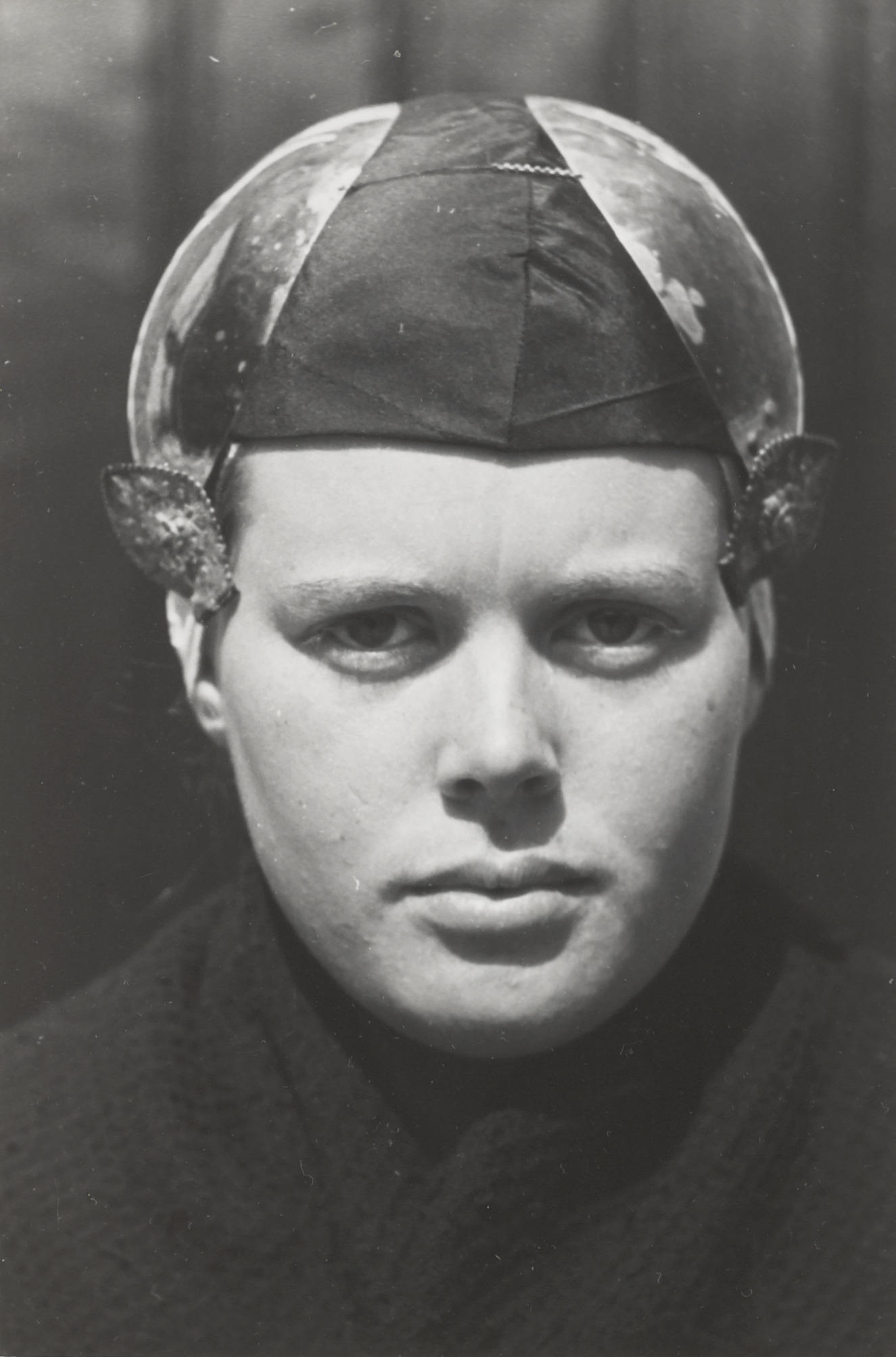 Meisje met een zilveren oorijzer. Dit oorijzer is afkomstig van het weeshuis in Workum. Het werd vroeger gedragen door de daar wonende weesmeisjes.
