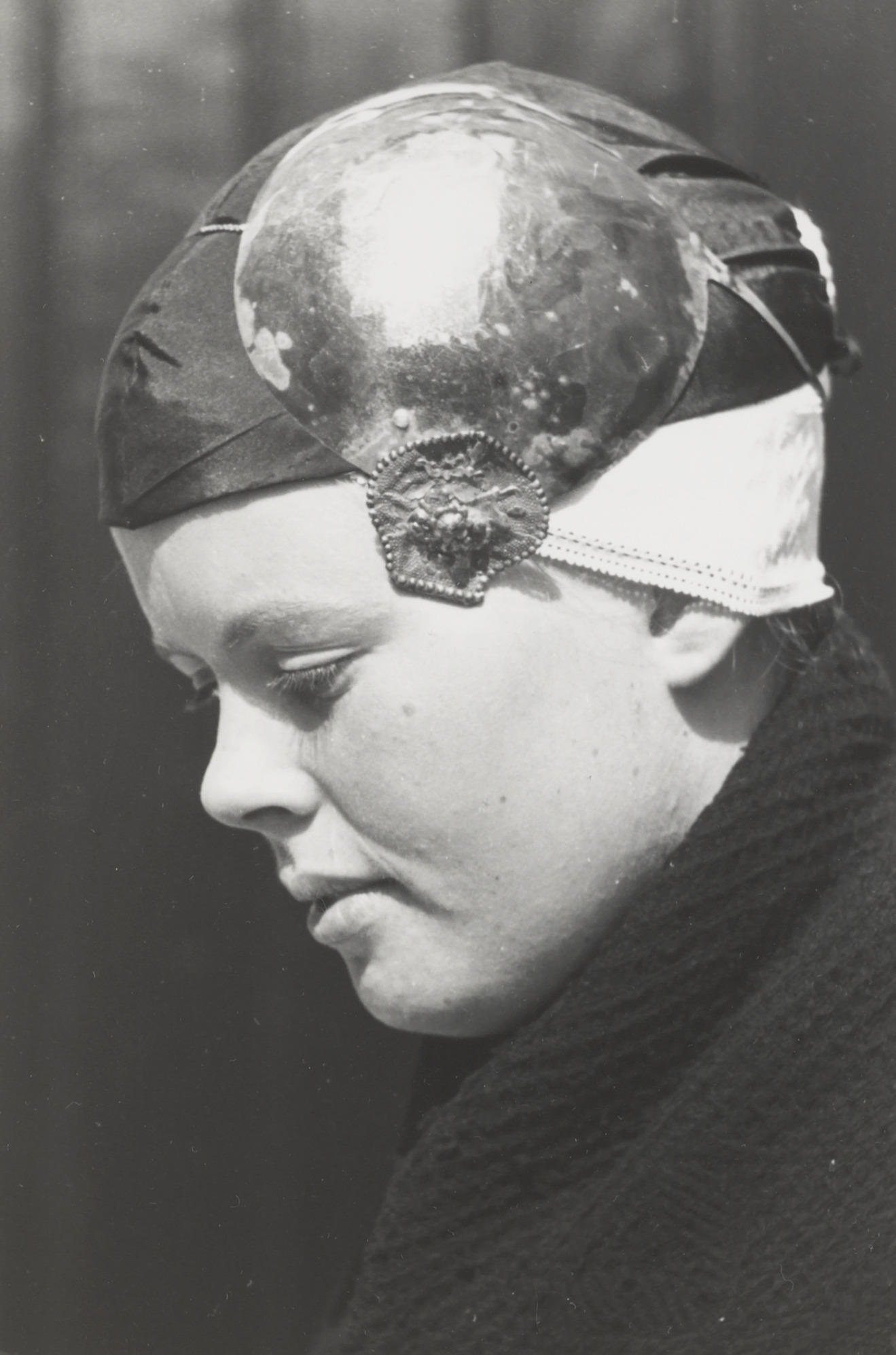Meisje met een zilveren oorijzer over een witte ondermuts en een zwarte tussenmuts. Dit oorijzer is afkomstig van het weeshuis in Workum. Het werd vroeger gedragen door de daar wonende weesmeisjes.