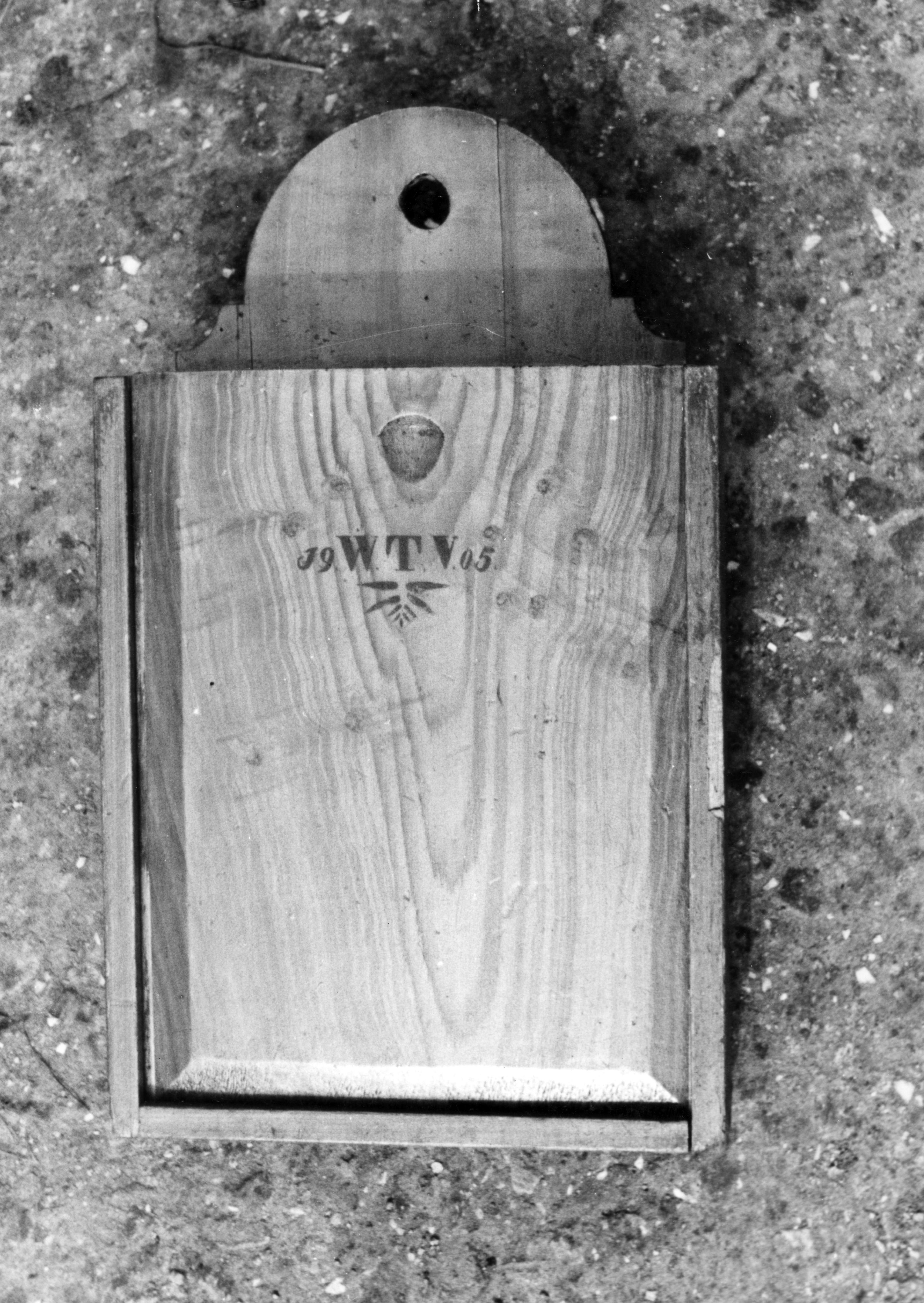 Houten schooltas, zogenoemd 'schoolbord', beschilderd met houtimitatie en voorzien van de initialen 'W.T.V.' en het jaartal 1905. De tas is eigendom van een familie in Molkwerum.