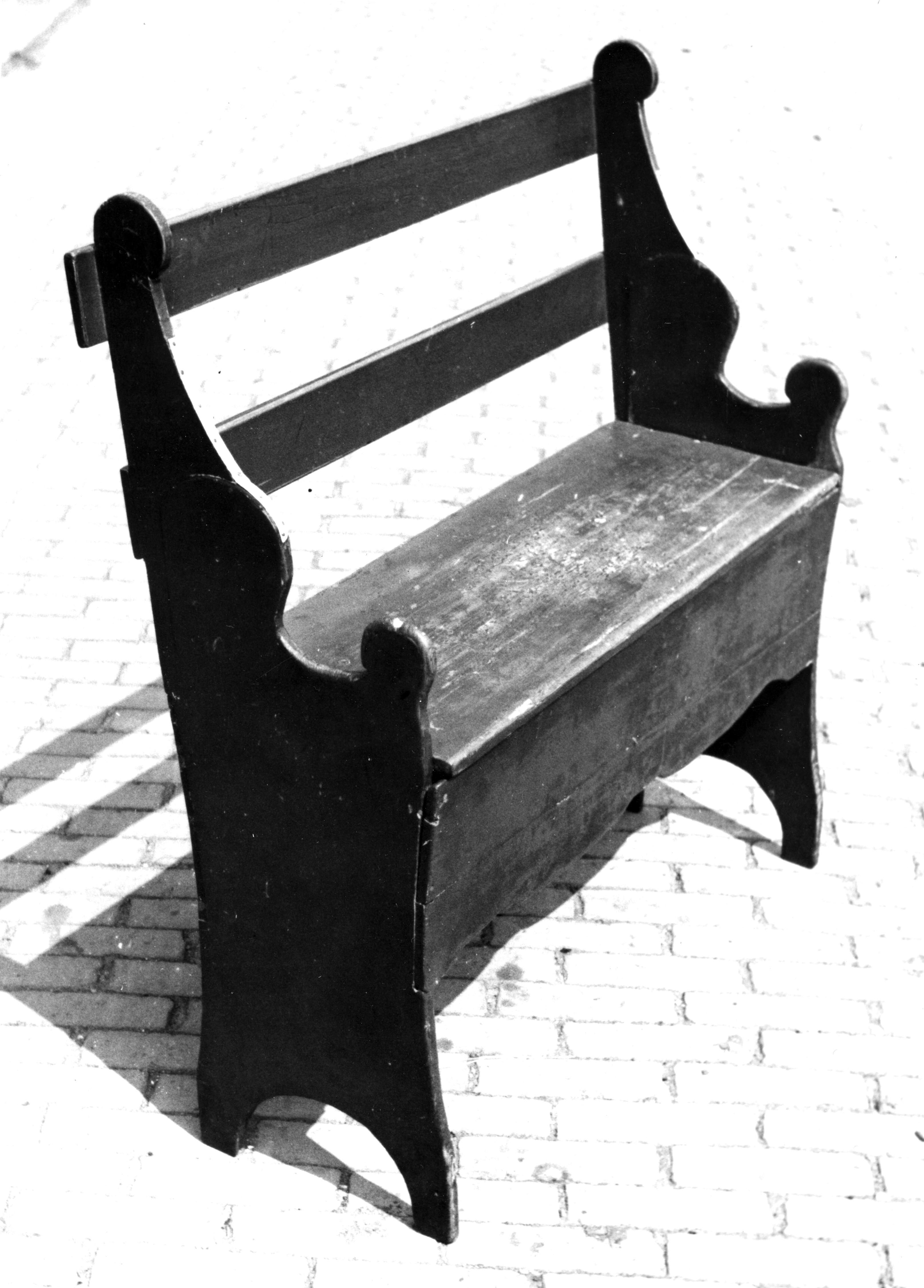 Houten kinderbankje. De zitting kan worden opgeklapt. Het bankje is eigendom van een familie in Molkwerum.