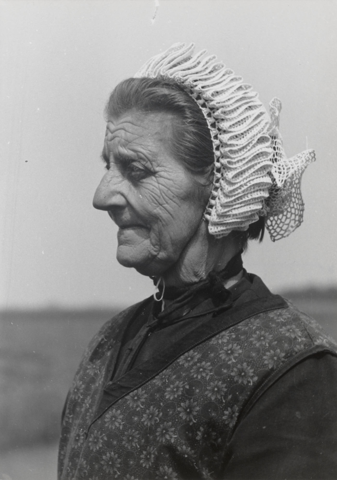 Weduwe Visser uit Molkwerum, gekleed in Friese streekdracht. Ze draagt de daagse dracht met een gehaakte muts.