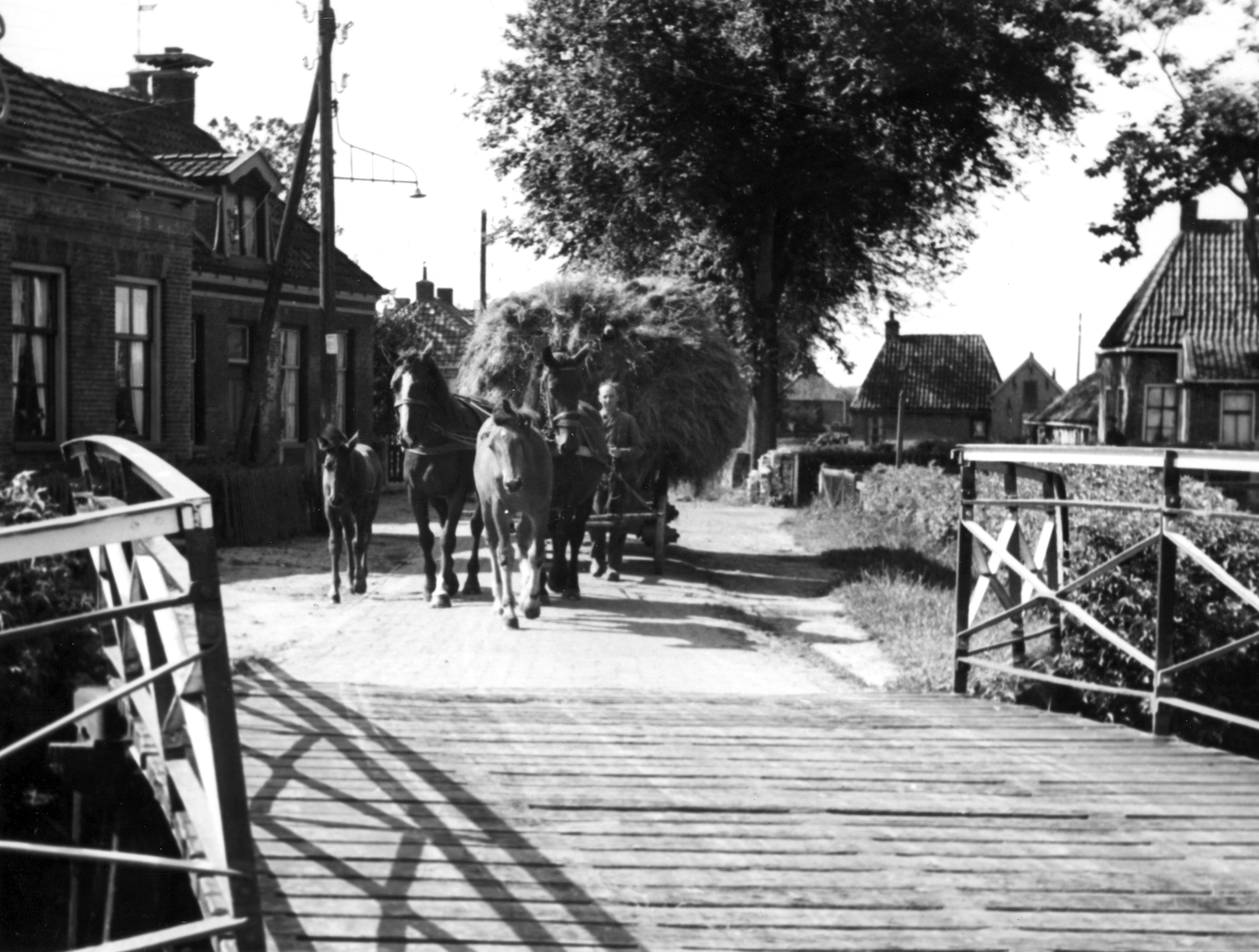 Hooiwagen, getrokken door twee paarden, bij een brug in Molkwerum. De twee veulens lopen los mee.