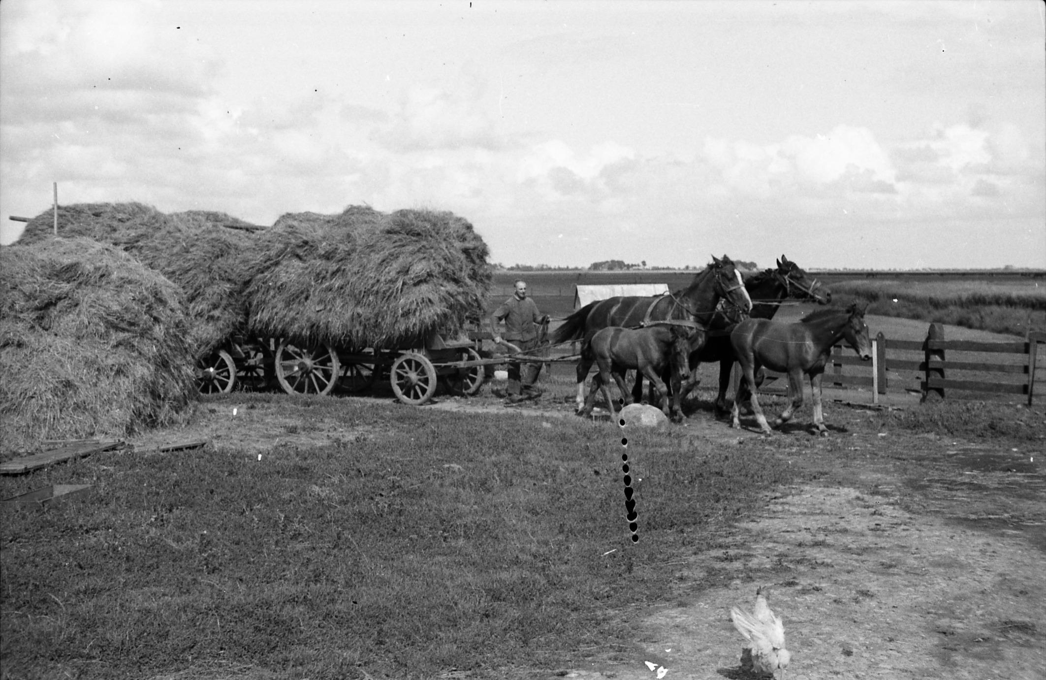 Hooiwagen met paarden en veulens, Molkwerum, 1944 (zwart-wit negatief)