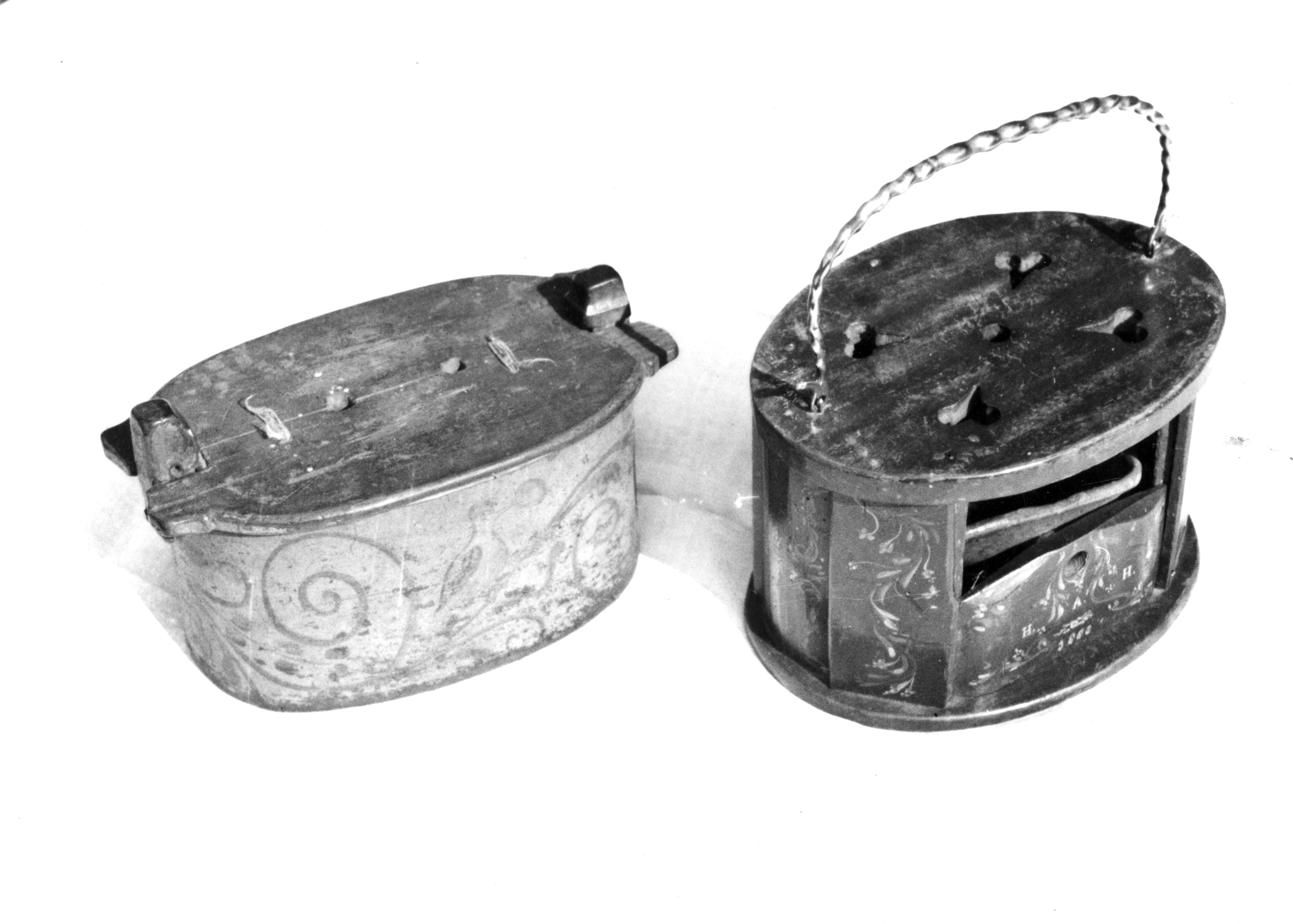 Miniatuurbutte en miniatuurkerkstoof, beide voorzien van Hindelooper schilderwerk. Op de stoof staat het jaartal 1885. Beide komen uit de verzameling van een familie in Molkwerum.