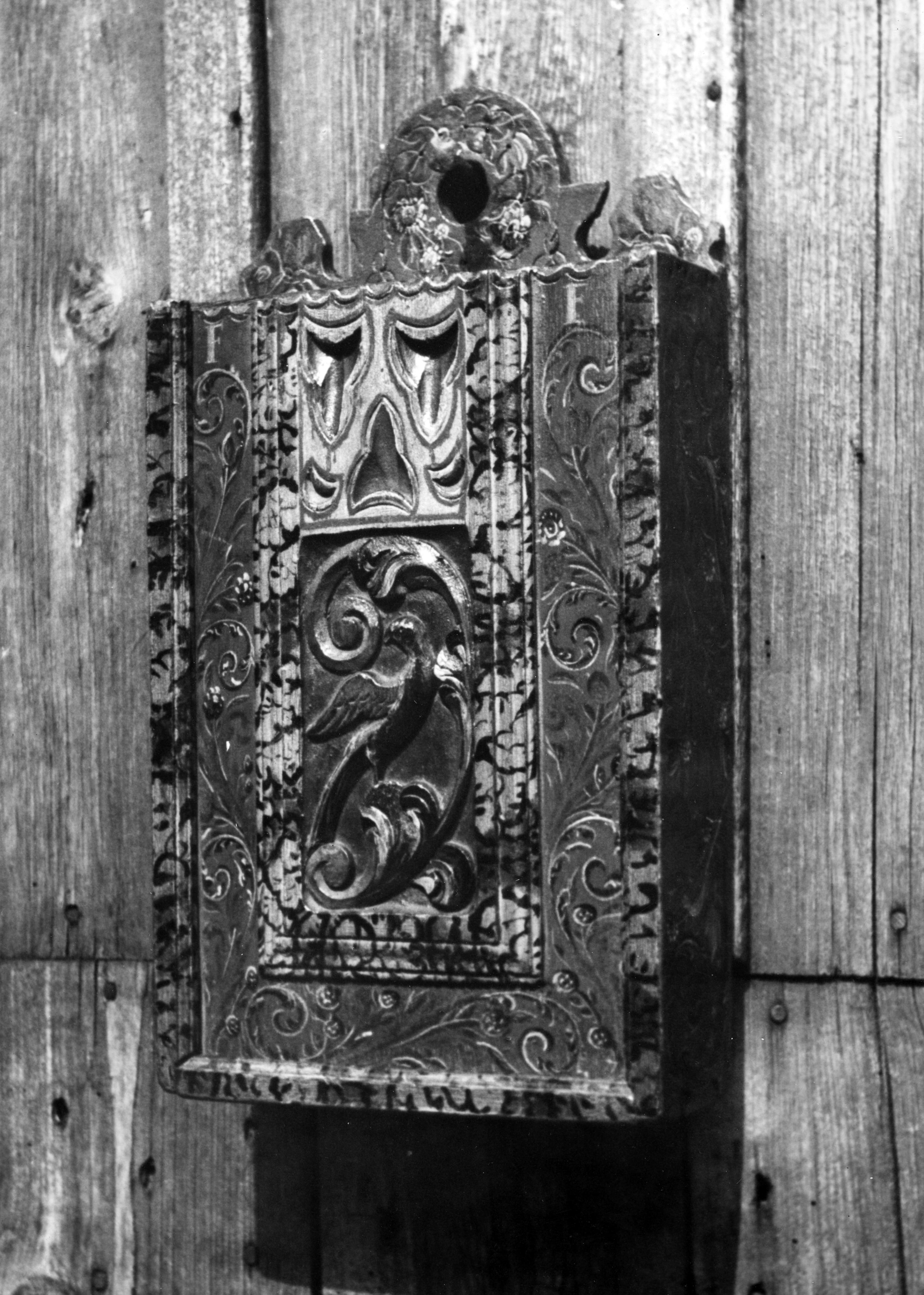Schooltas met Hindelooper beschildering uit Molkwerum, 1944 (zwart-wit foto)