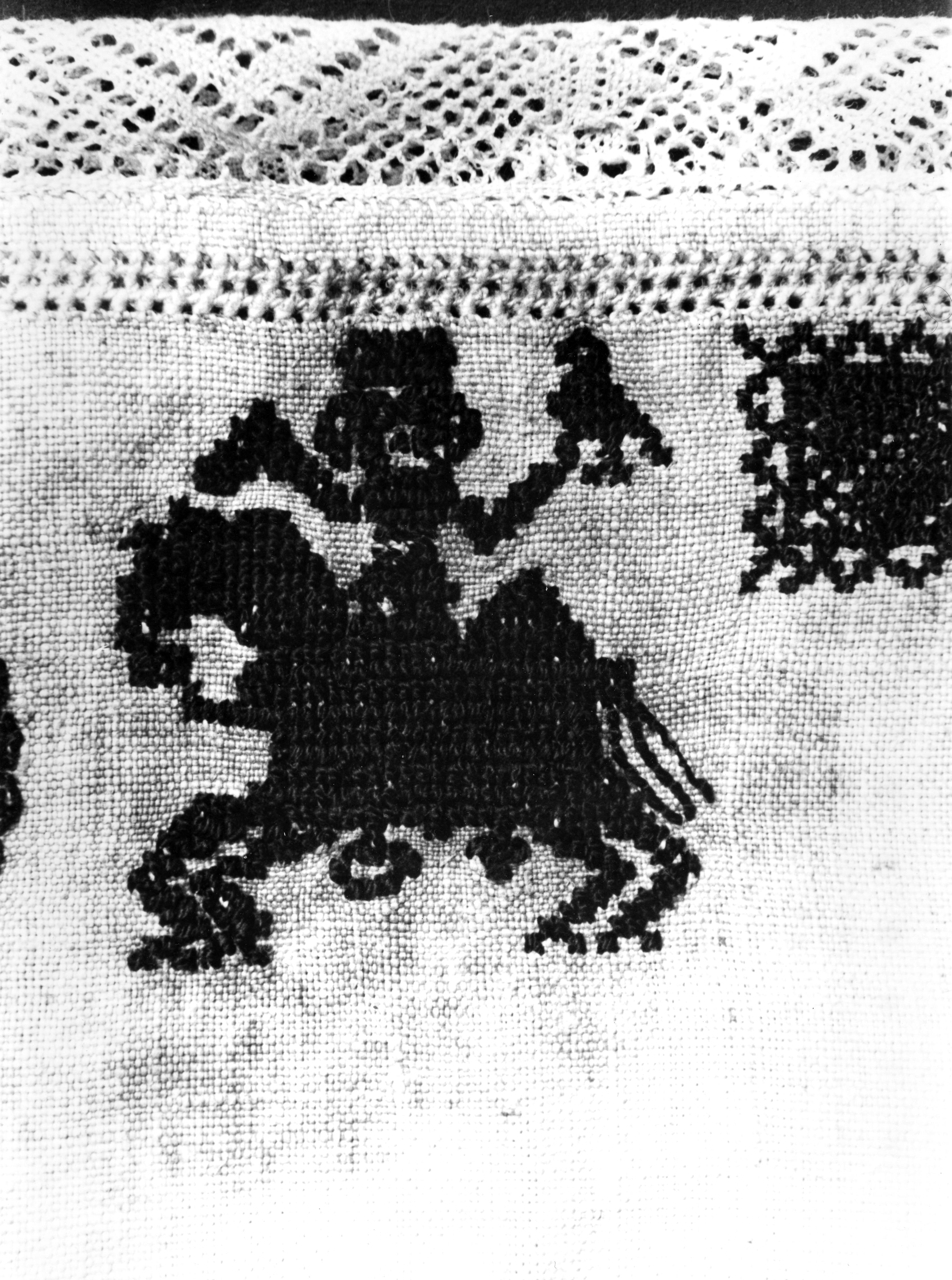 Kussensloop met kruissteekborduurwerk, Marken, 1943 (zwart-wit negatief)