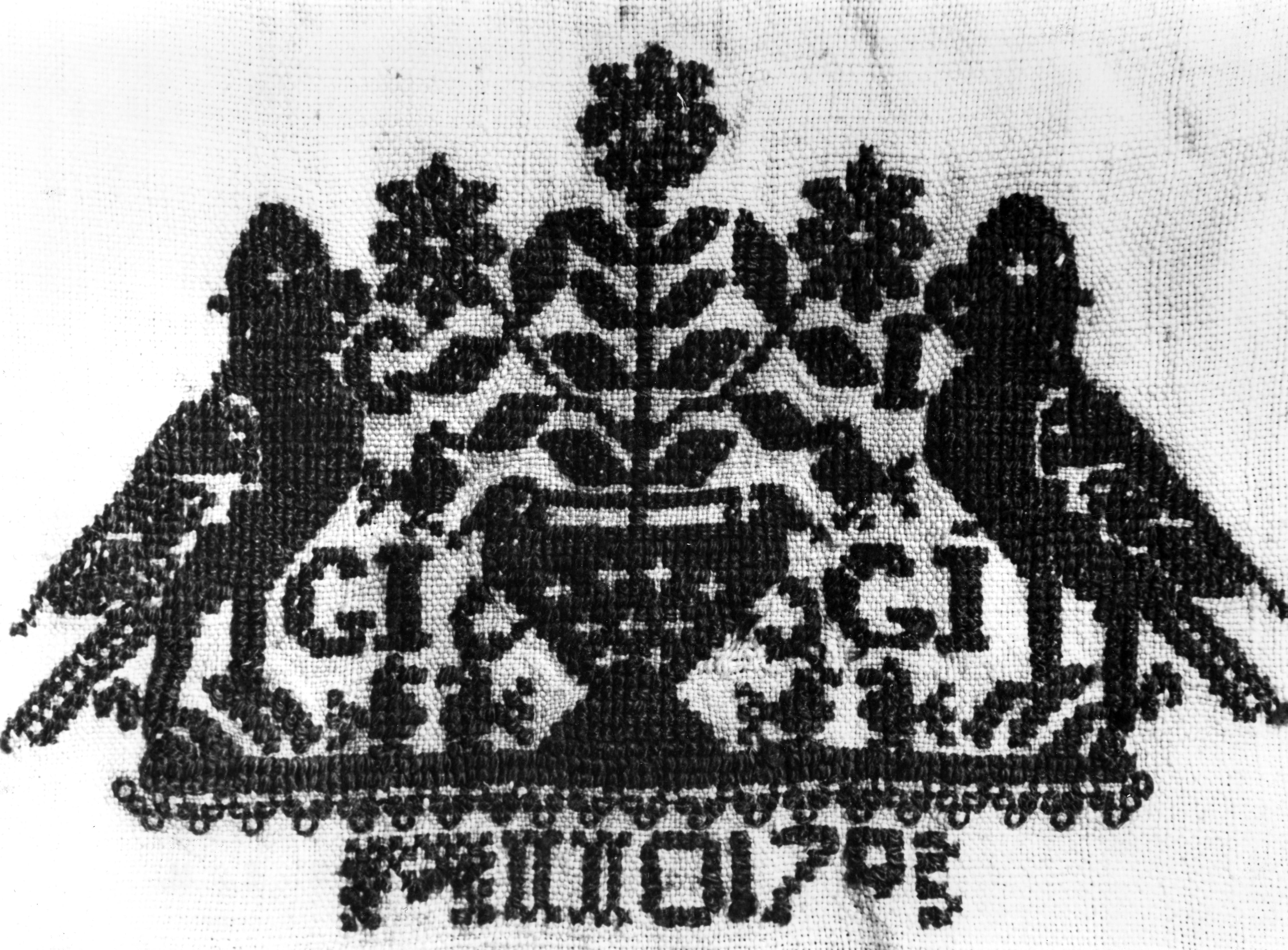 Detail van een spreitje met kruissteekborduurwerk, gefotografeerd op Marken. In het motief staan drie keer de initialen 'G.I.' en de datering 1793. Adres: Witte Werf 14 op Marken.