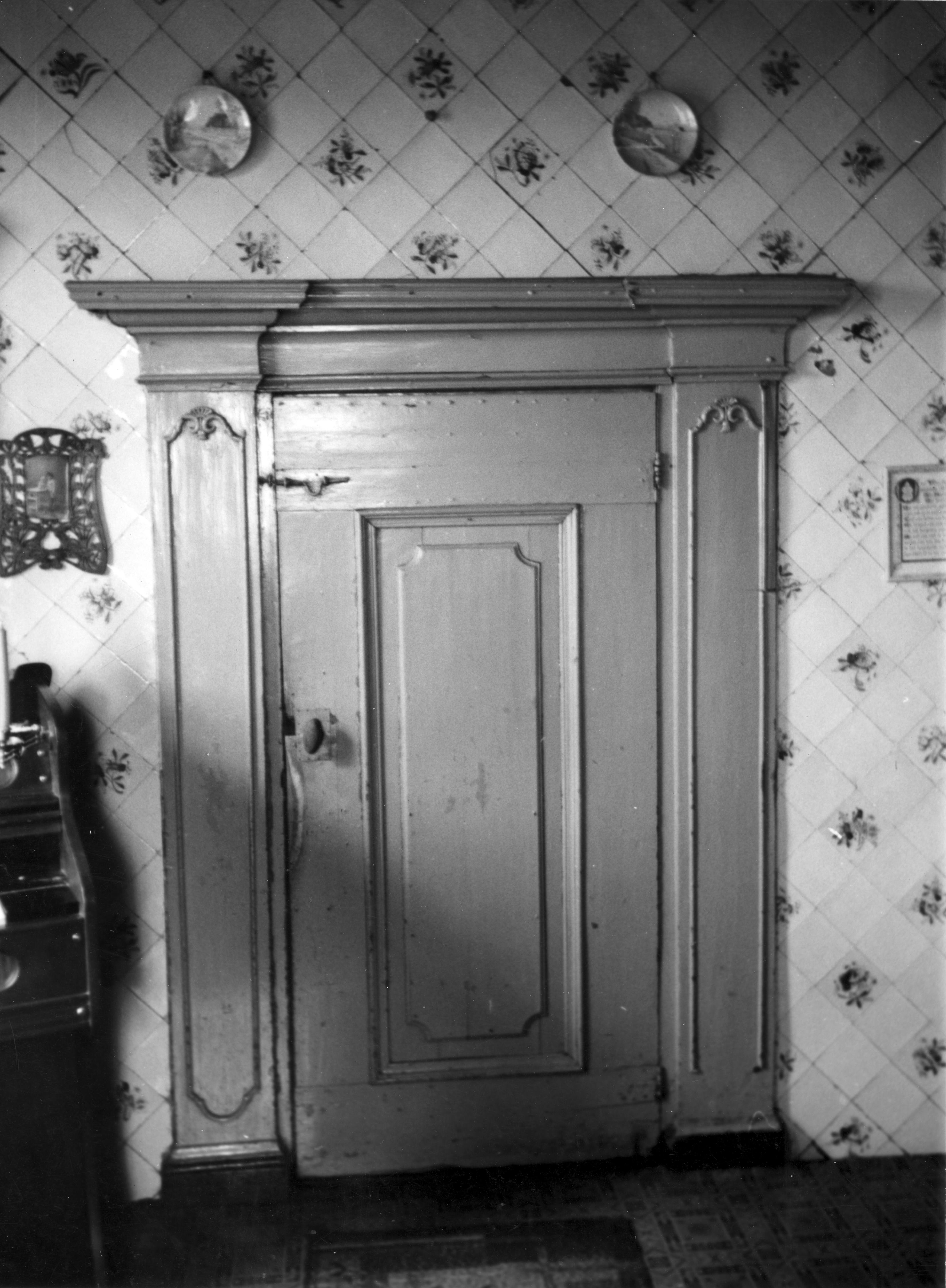Deur met bewerkte omlijsting in een betegelde wand. De wandtegels zijn diagonaal geplaatst. De opname is gemaakt in een woning in Warns.