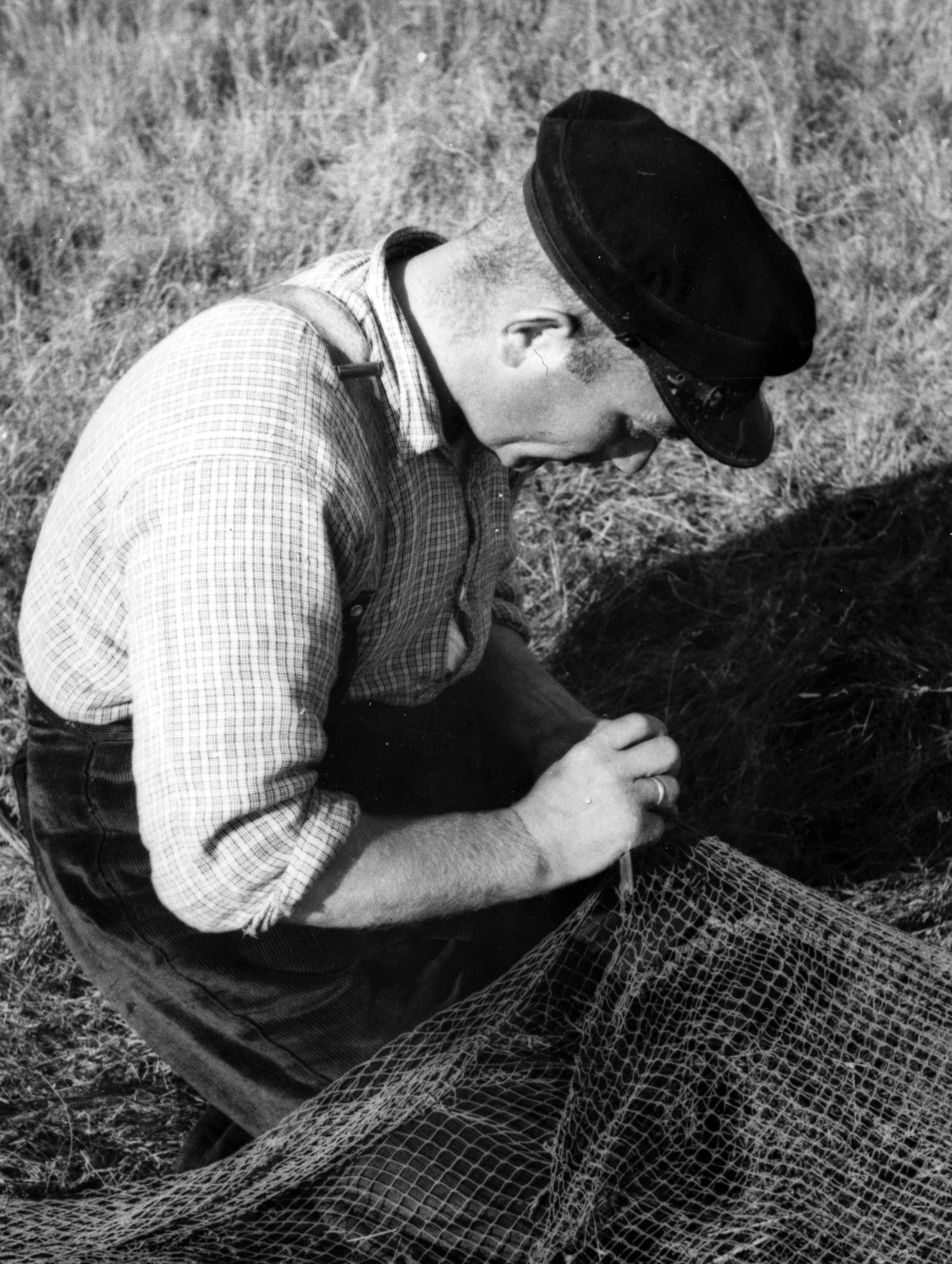 Visser uit Laaxum aan het netten boeten, 1944 (zwart-wit foto)