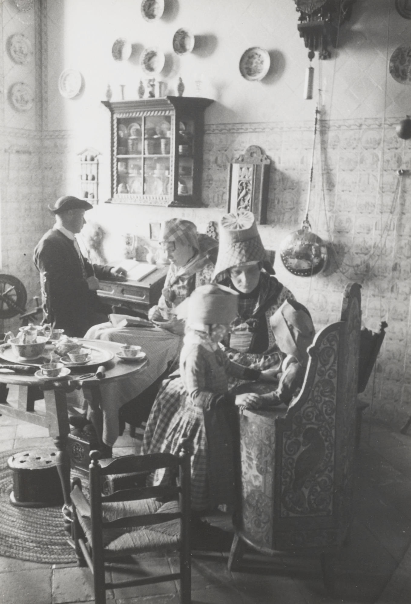 Man, meisjes en vrouw, verkleed in Hindelooper streekdracht, in het interieur van het museum in Hindeloopen.