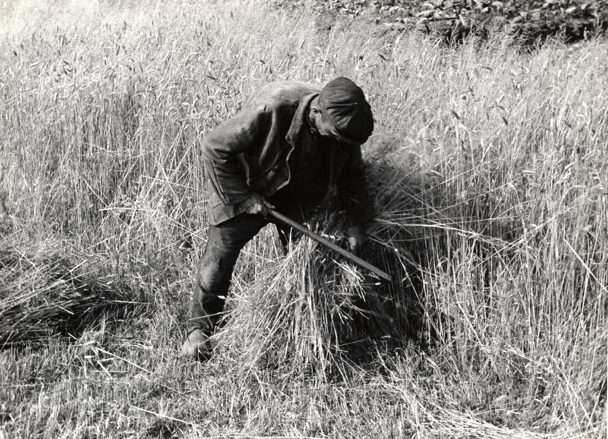 Binden van rogge, Staphorst, 1944 (zwart-wit foto)