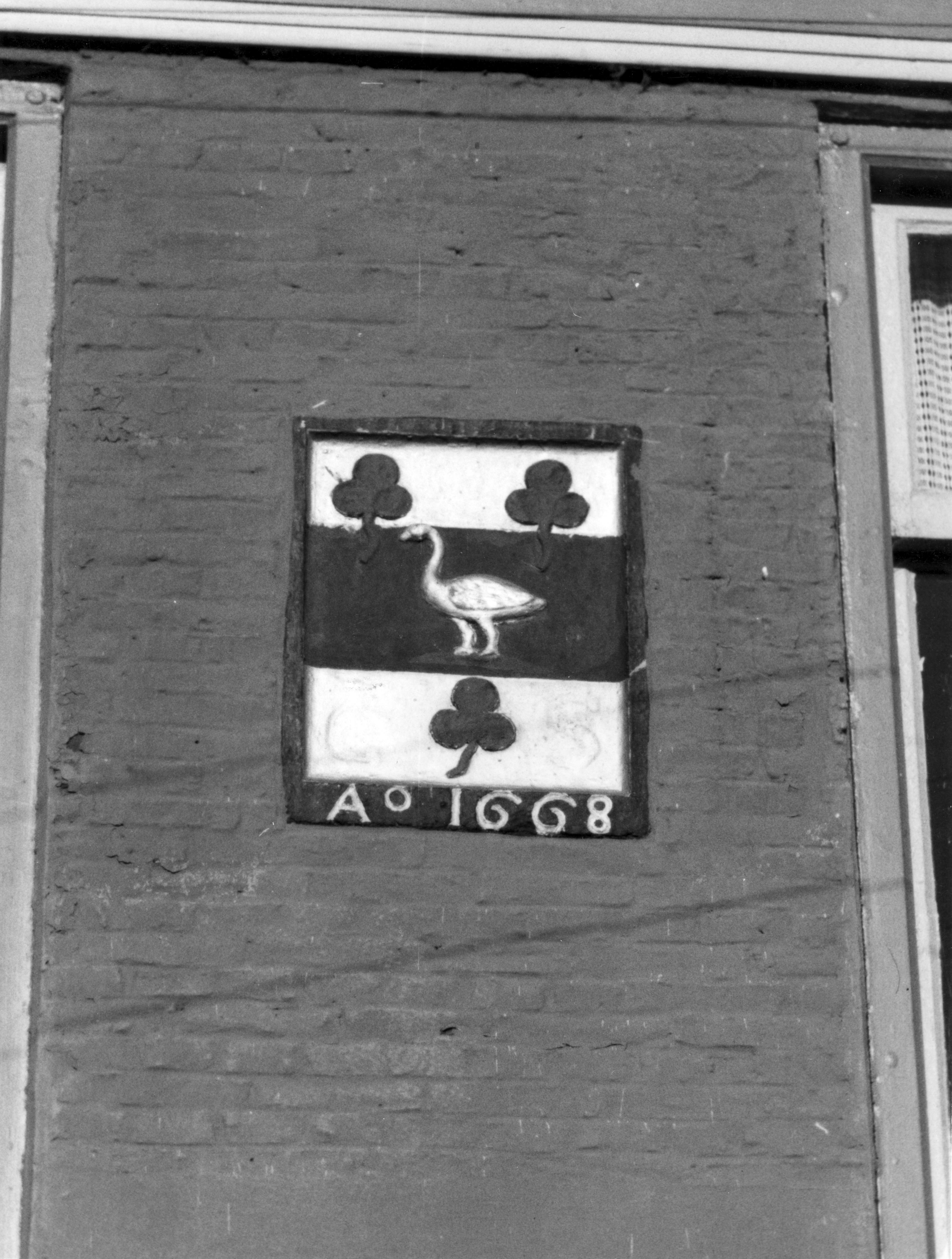 Gevelsteen in een gevel in Kuinre. Op de gevelsteen staan het jaartal 1668 en het wapen van Kuinre met een zwaan en drie klaverblaadjes.