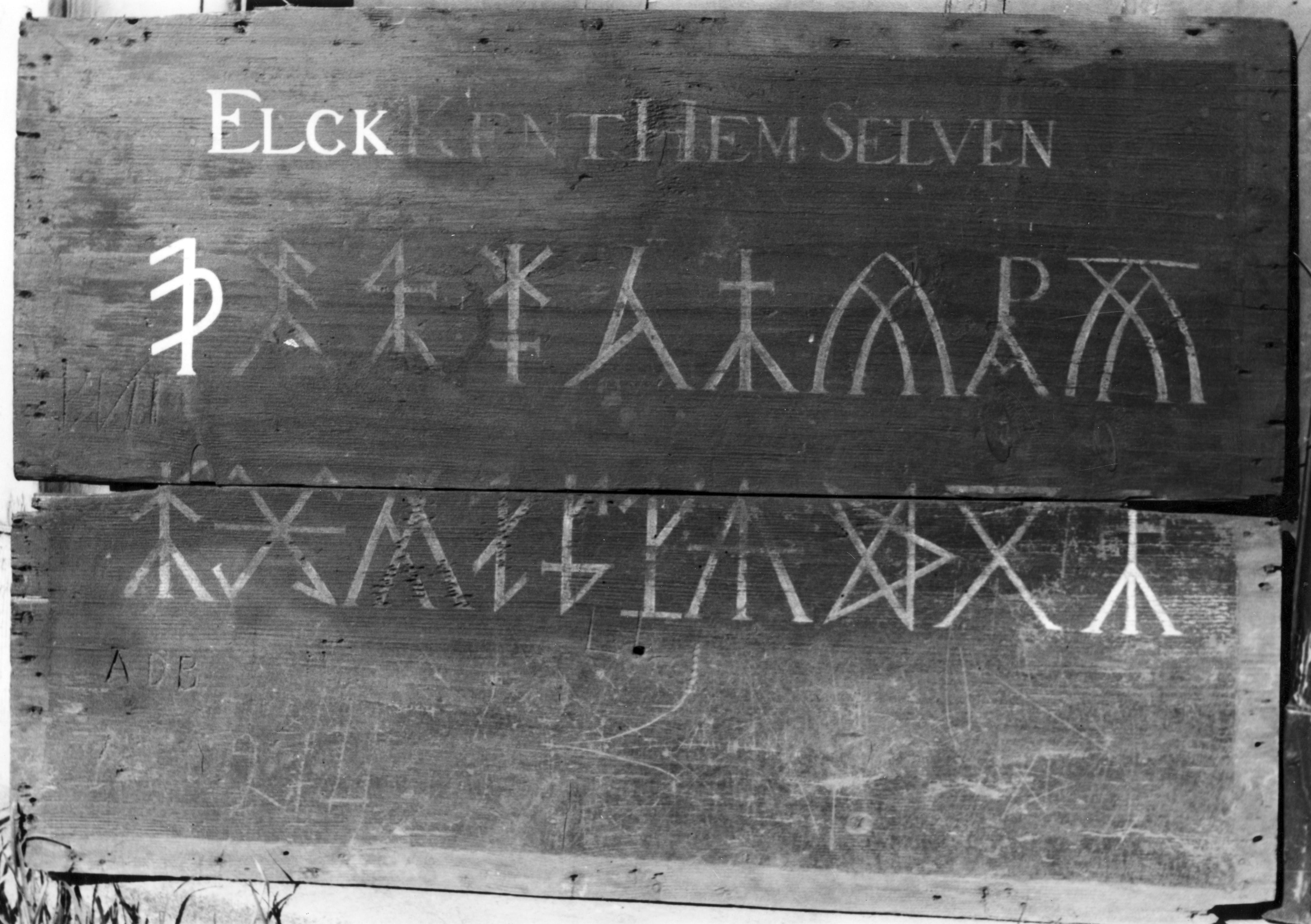 Bord met huismerken, Kuinre, 1944 (zwart-wit foto)