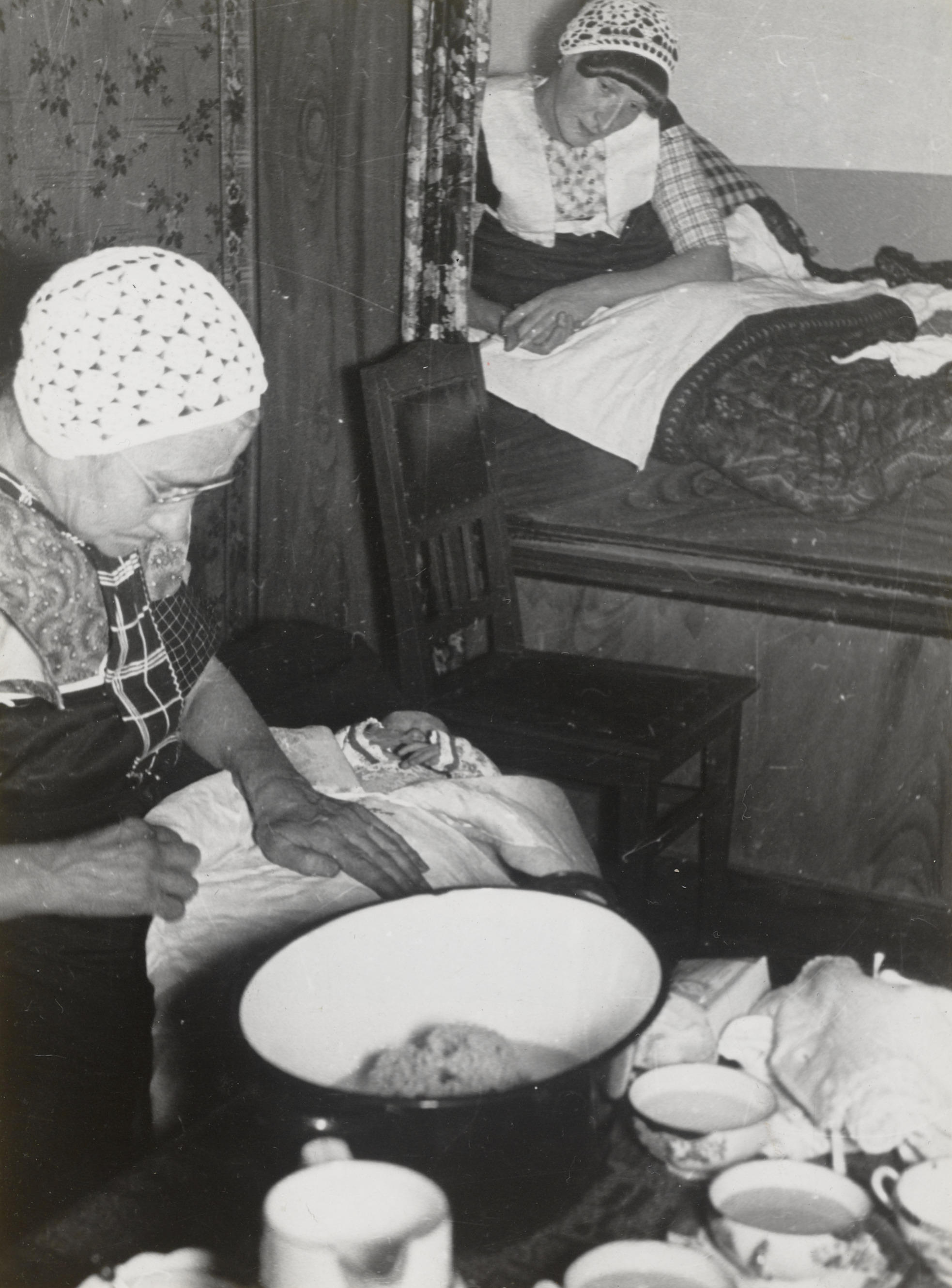 Nog in de jaren dertig van de twintigste eeuw moest een vrouw in Spakenburg na de bevalling veertien dagen in bed blijven. Soms bleven de bedgordijnen de eerste week gesloten. Men was bang voor kraamvrouwenkoorts. Moeder en baby werden verzorgd door haar moeder of door een baker. Deze hielden vaak oude gewoontes in stand. Het ...