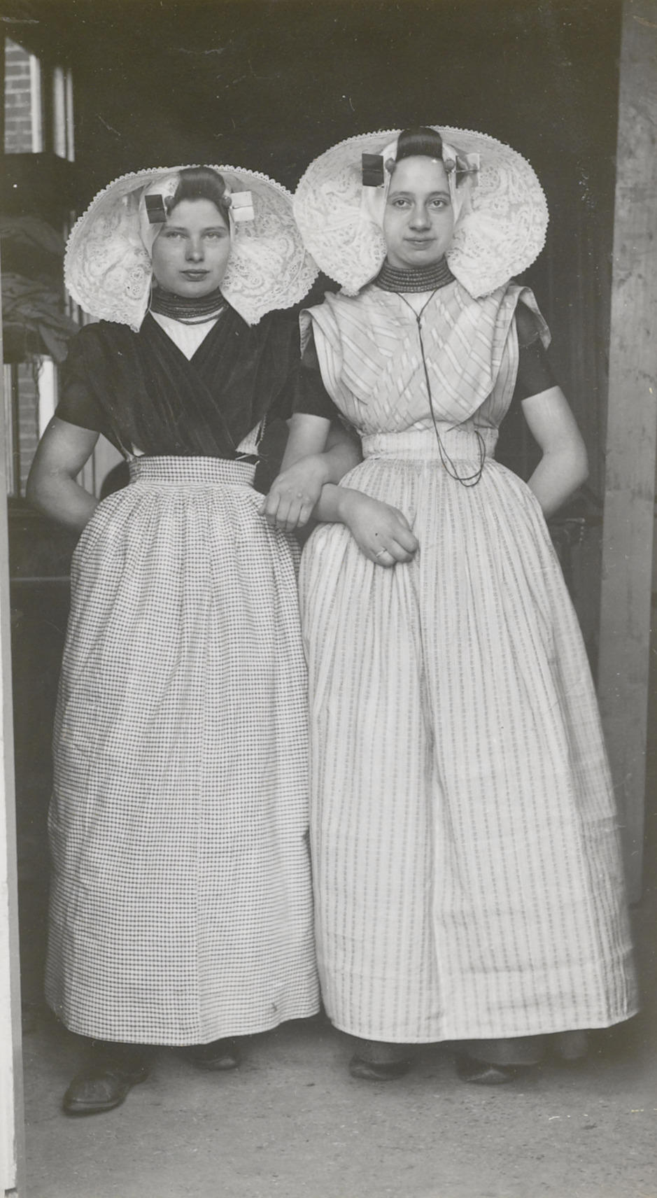 Twee jonge vrouwen in protestantse Zuid-Bevelandse streekdracht. Ze zijn gekleed in doordeweekse opknapdracht.