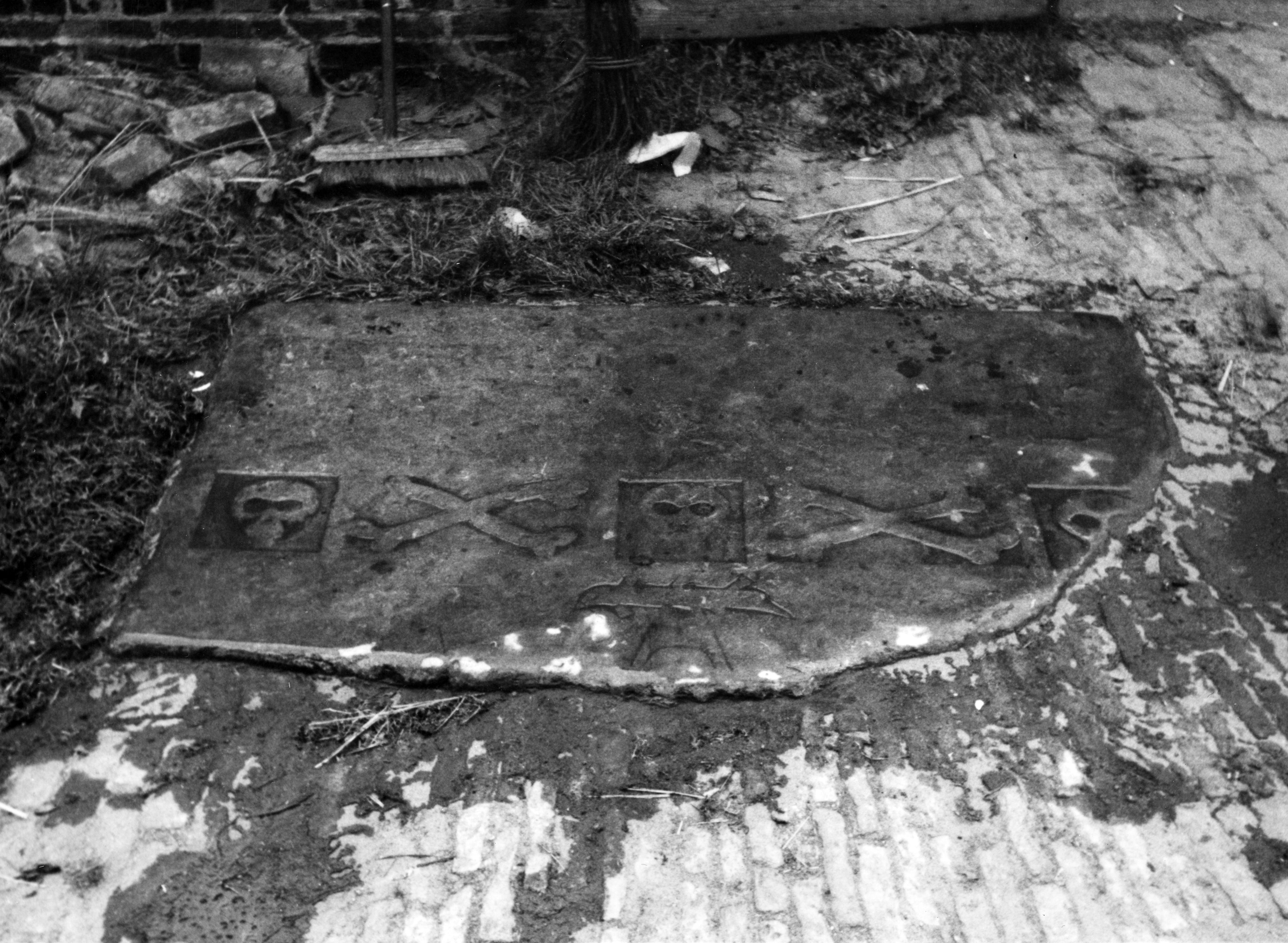 Grafsteen met huismerken, Kuinre, 1944 (zwart-wit foto)
