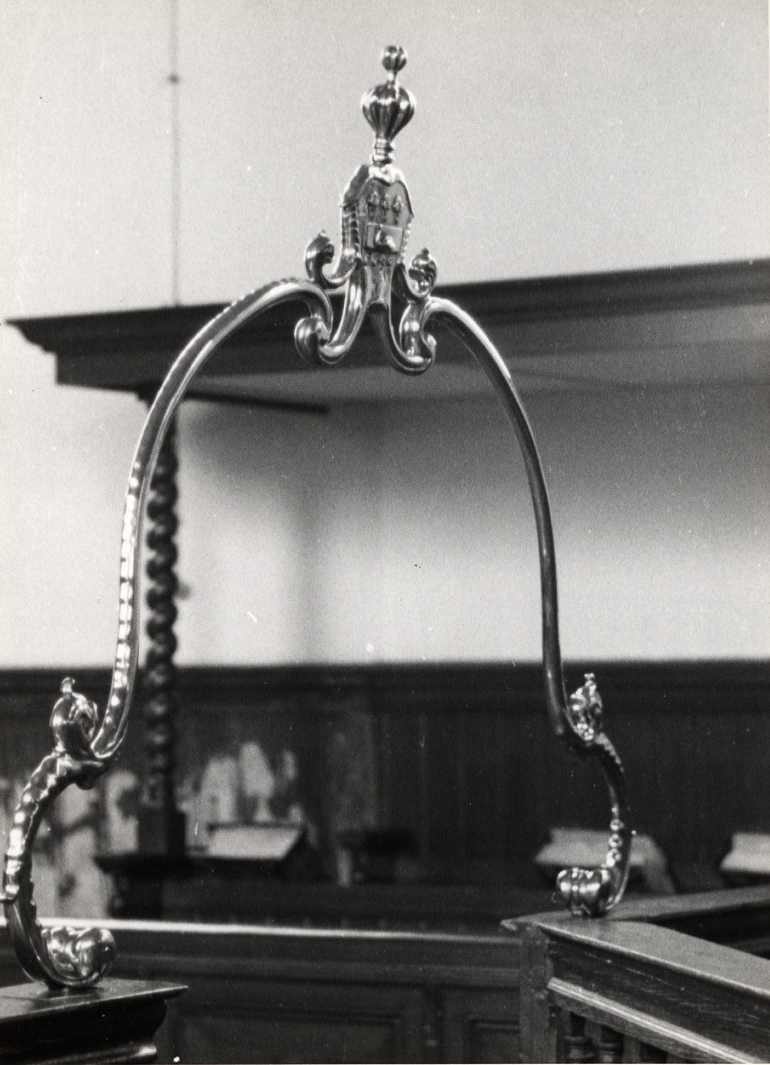 Koperen boog met het wapen van Kuinre. Eén van de twee bogen boven de beide toegangen van het doophek in de Nederlandse Hervormde Kerk in Kuinre.