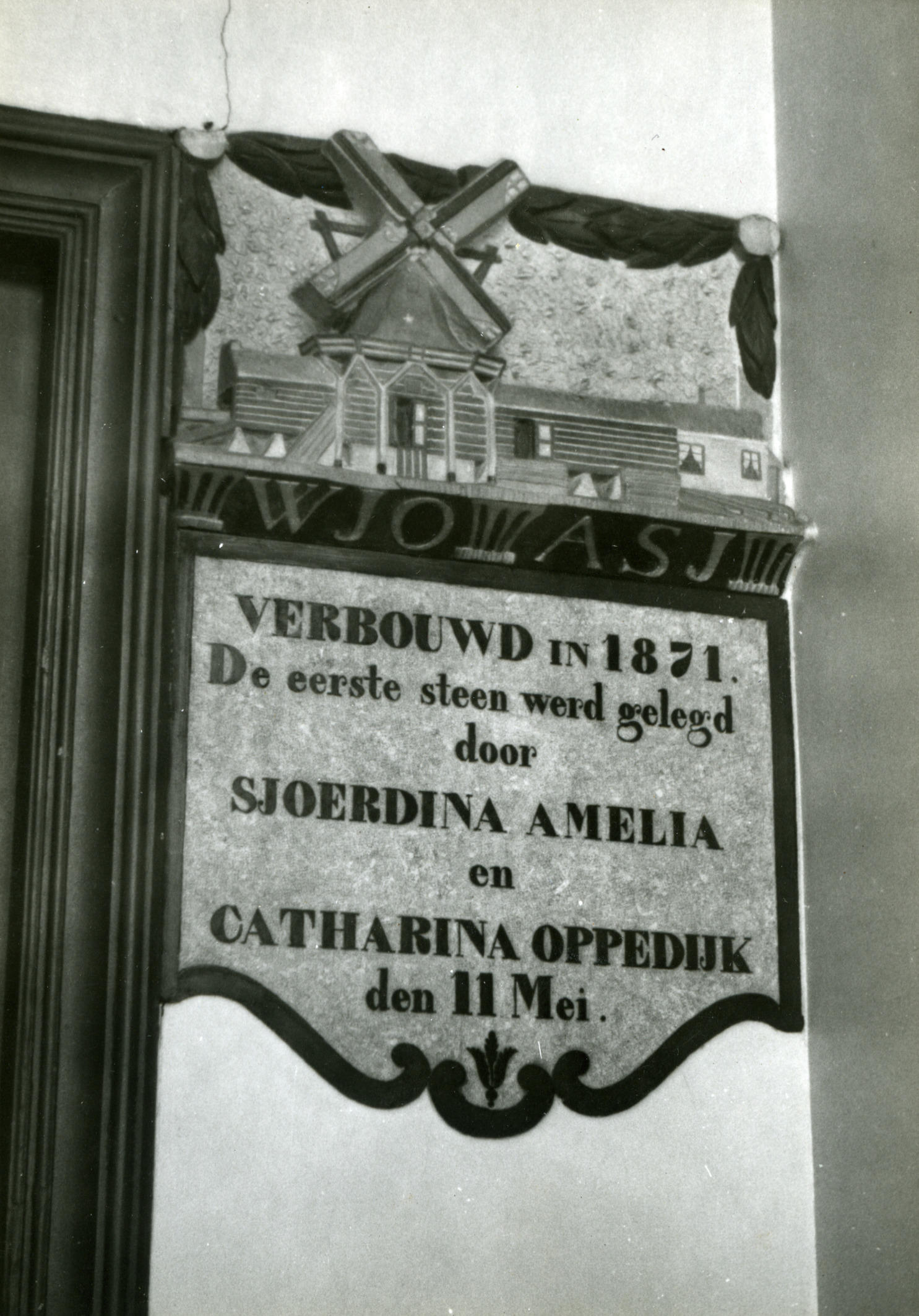 Gevelsteen met een afbeelding van een houtzaagmolen, de initialen 'W.J.O.' en 'A.S.J.' en de tekst 'Verbouwd in 1871. De eerste steen werd gelegd door Sjoerdina Amelia en Catharina Oppedijk den 11 mei'. De gevelsteen is hier aangebracht in de hal van het huis.