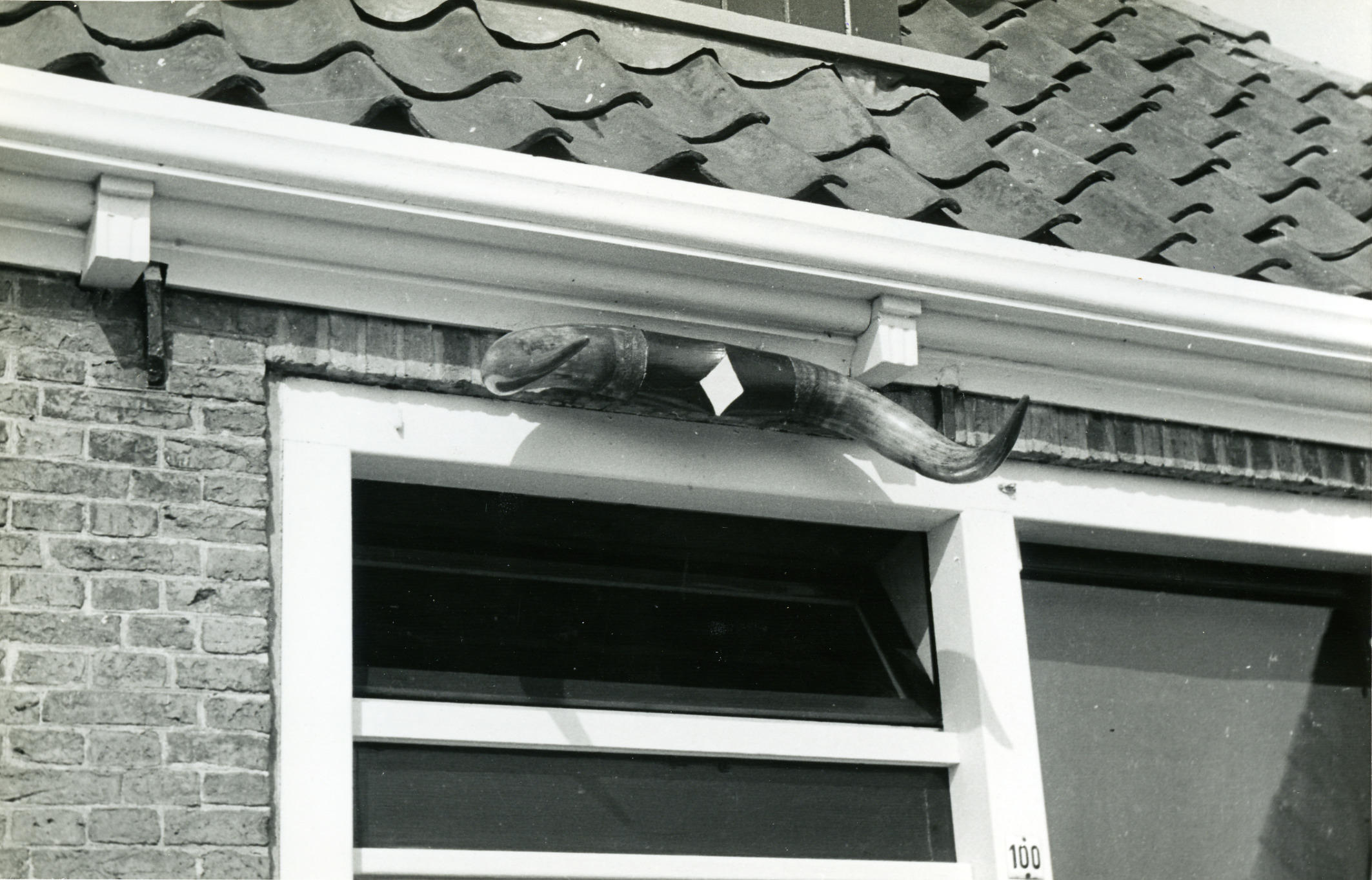 Uithangteken met hoorns bij een slagerij, Parrega, 1944 (zwart-wit foto)