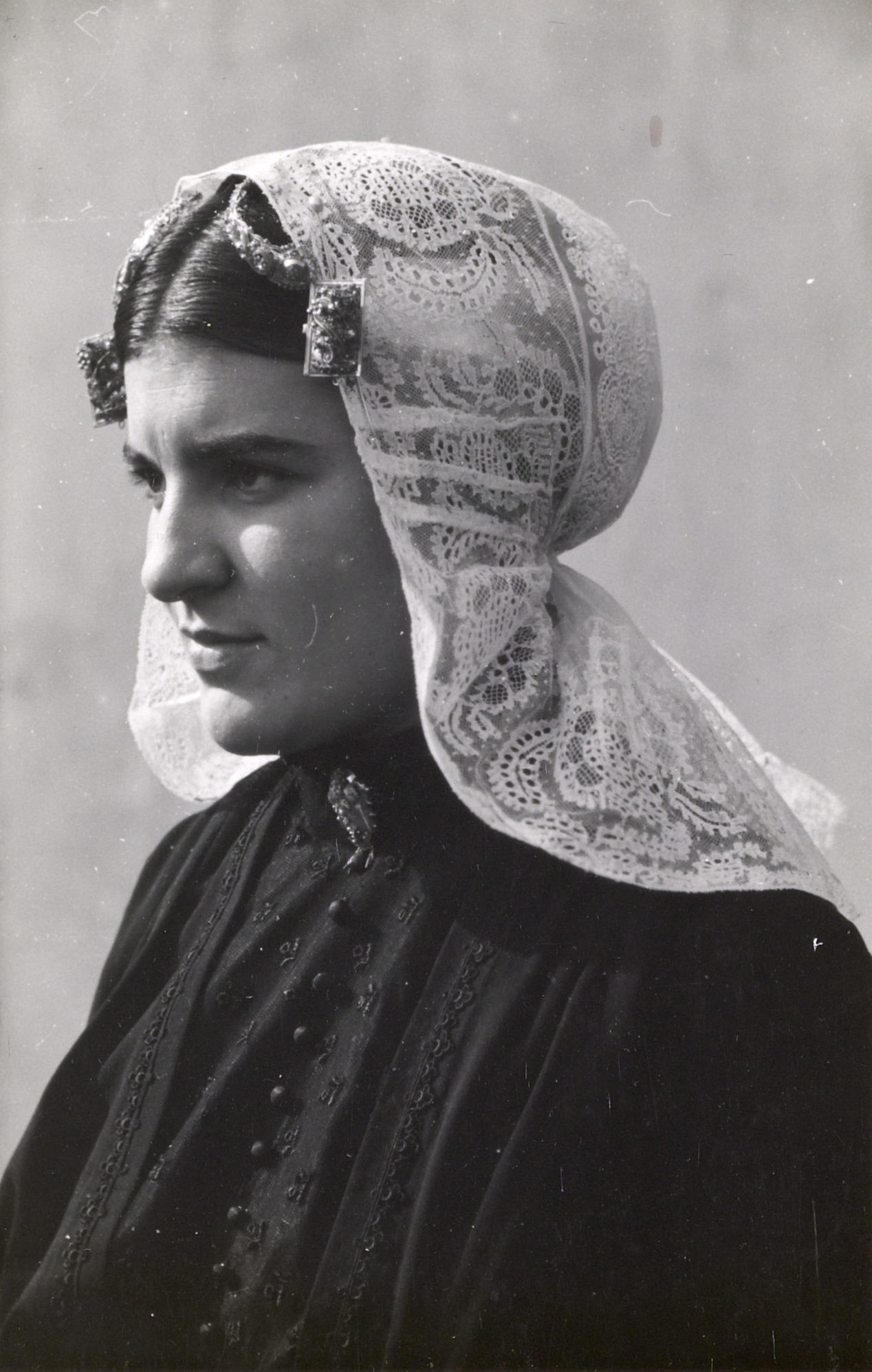 Dirkje Verdoes-Zwaan (*1924) heeft zich speciaal voor de foto verkleed in de Katwijkse streekdracht. Ze draagt de zogenaamde burgerdracht met de 'burgerkap'. Deze hoofdtooi werd tot circa 1915 algemeen in deze regio door de burgervrouwen in streekdracht gedragen bij speciale gelegenheden. De hoofdtooi bestaat uit een gouden oorijzer met gouden 'boeken' aan de uiteinden, een ...