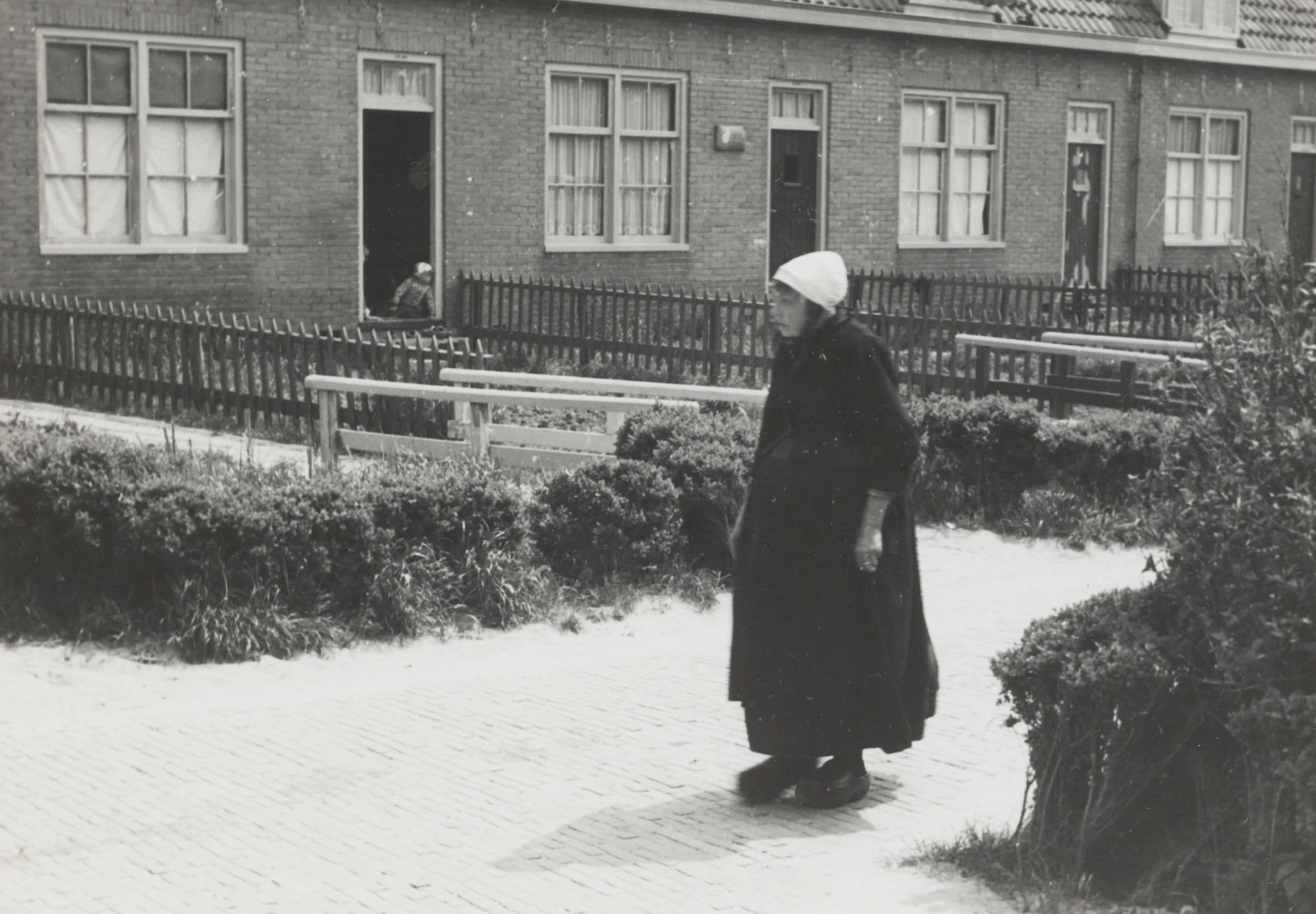 Vrouw in rouwdracht, onderweg naar een begrafenis op Marken.