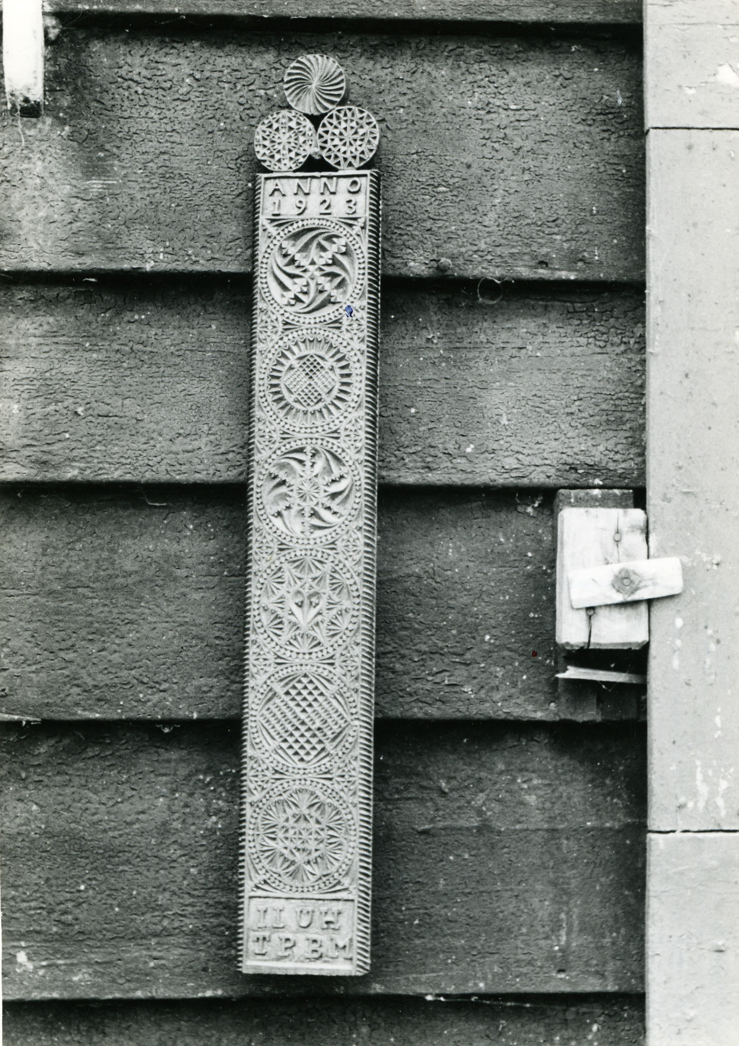 Mangelplank met kerfsnedeversiering, de initialen 'IIUH' en 'TPBM' en het jaartal 1923. De mangelplank is gefotografeerd op Marken.