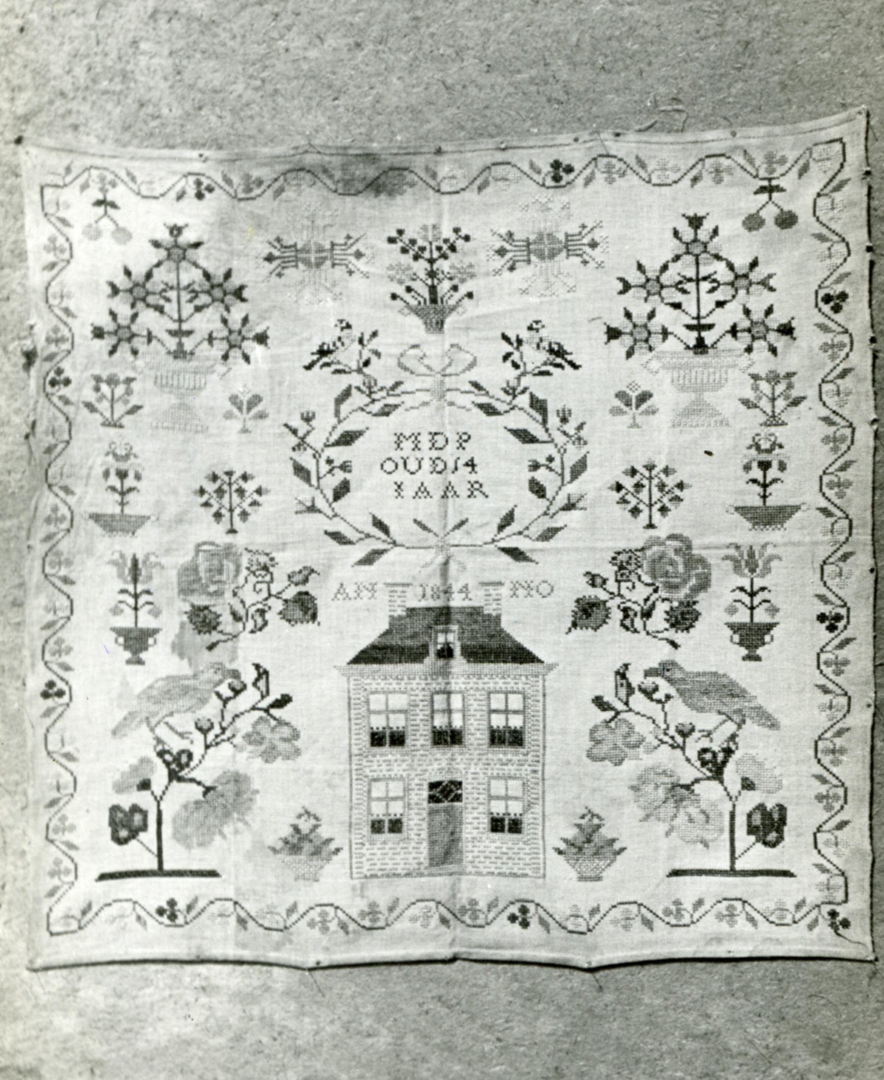 Merklap uit 1844, Katwijk aan Zee, 1945 (zwart-wit foto)