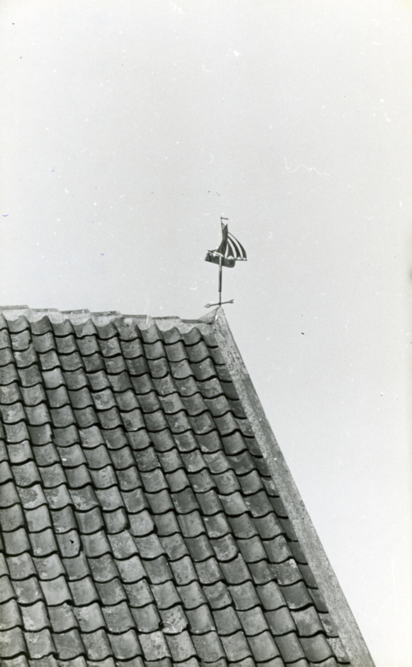 Een windwijzer met een bomschuit van verguld metaal op de nok van een rederij in Katwijk aan Zee.