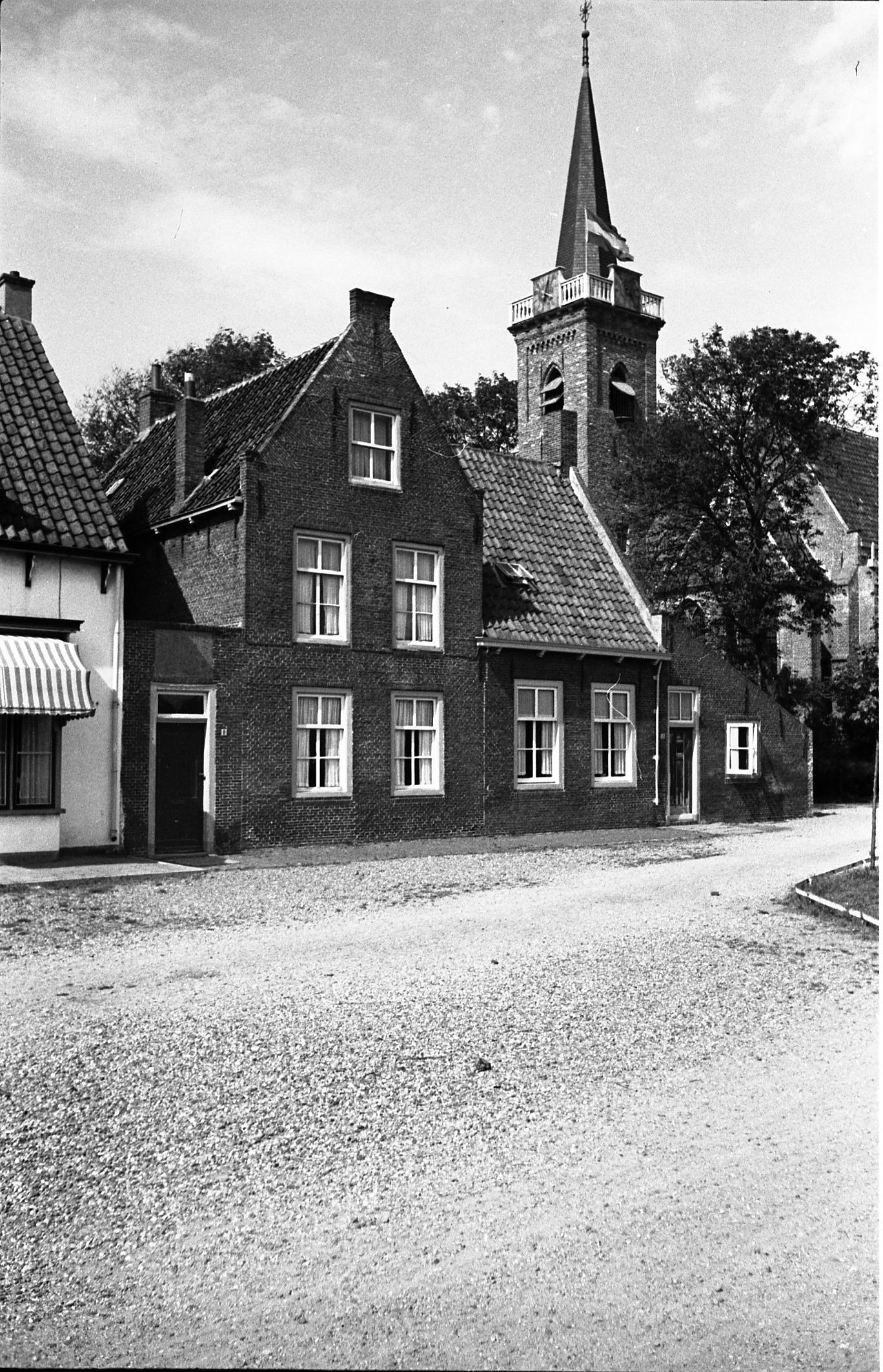 Dorpsgezicht in Katwijk aan den Rijn met de kerktoren van de dorpskerk en de voormalige dorpsschool uit 1805.