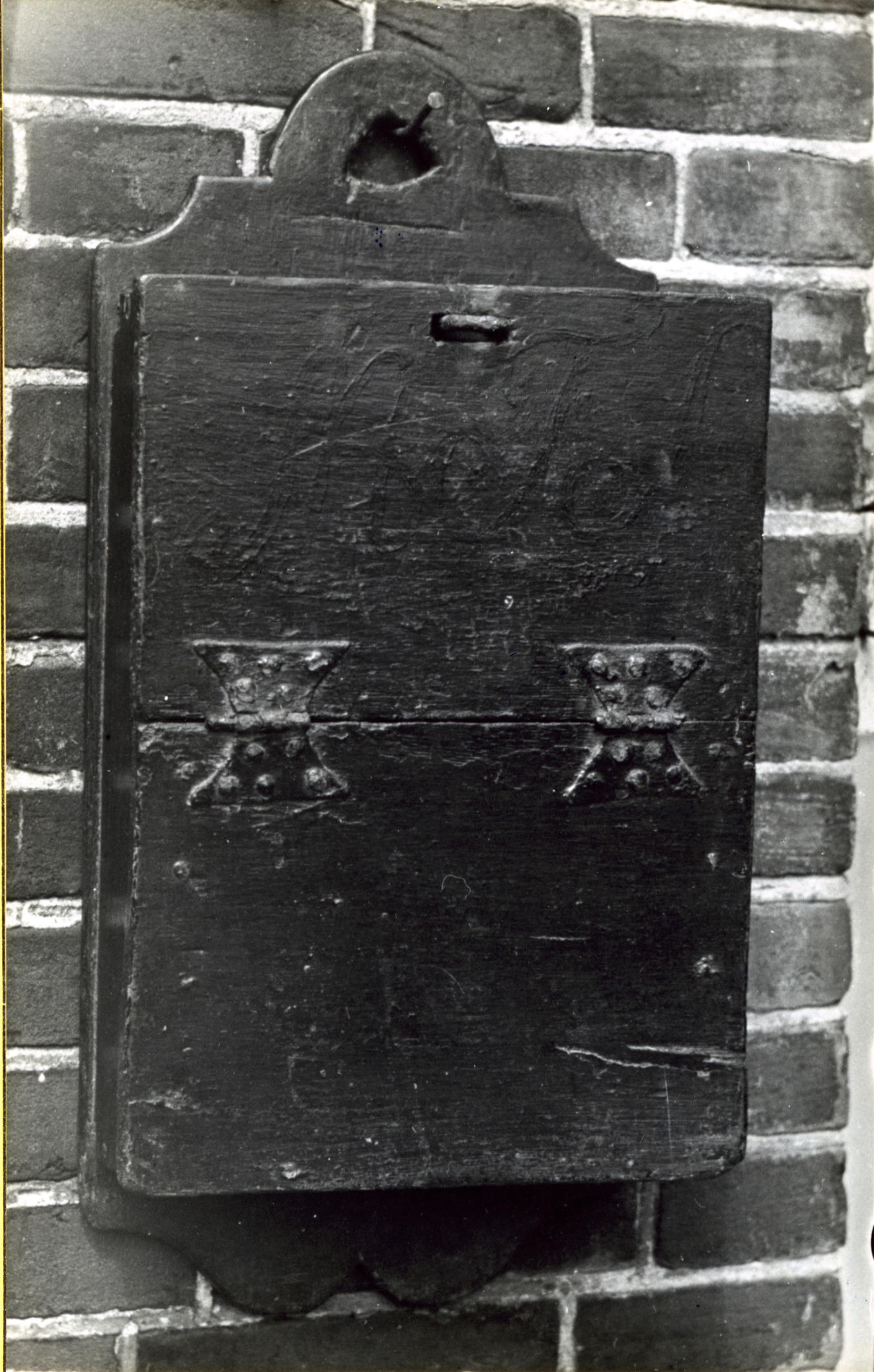 Houten schoolbord (schooltas) van Maarten Florisz. Schaap uit Katwijk aan Zee. De schooltas is donkerbruin geschilderd.