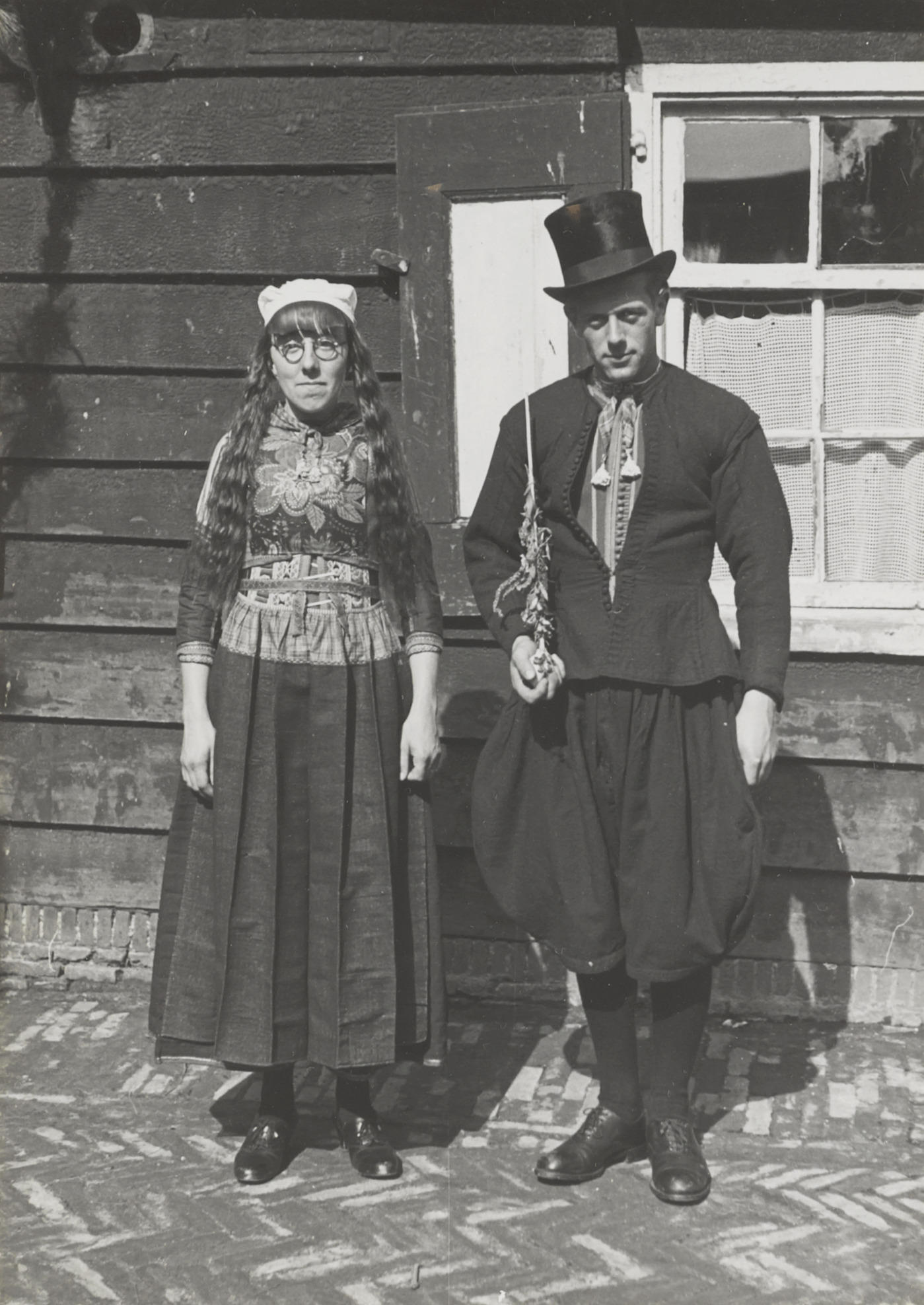 Lijsbeth Zeeman en Pieter Kes, verkleed in gelegenheidskleding ter gelegenheid van deelname aan een optocht waarbij een Marker bruiloft werd uitgebeeld. Deze optocht vond plaats op vrijdag 31 augustus 1945 vanwege Koninginnedag. Lijsbeth draagt zeer fraaie antieke zondagse dracht. Pieter is gekleed in de kleding van de 'rode bruidegom', tijdens het 'aantekenen'.