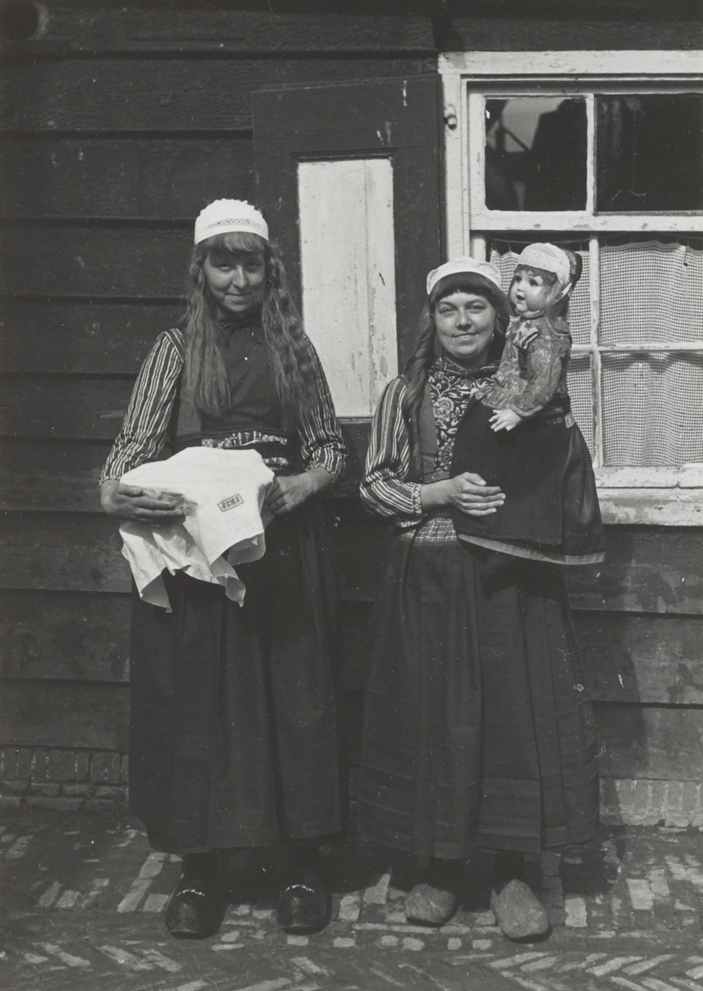 Neeltje Boneveld en Grietje Roos, verkleed als meisjes die gaan 'suikerstikken' ter gelegenheid van deelname aan een optocht waarbij een Marker bruiloft werd uitgebeeld. Deze optocht vond plaats op vrijdag 31 augustus 1945 vanwege Koninginnedag. Neeltje draagt een schaal met stikken, afgedekt met een witte linnen doek.