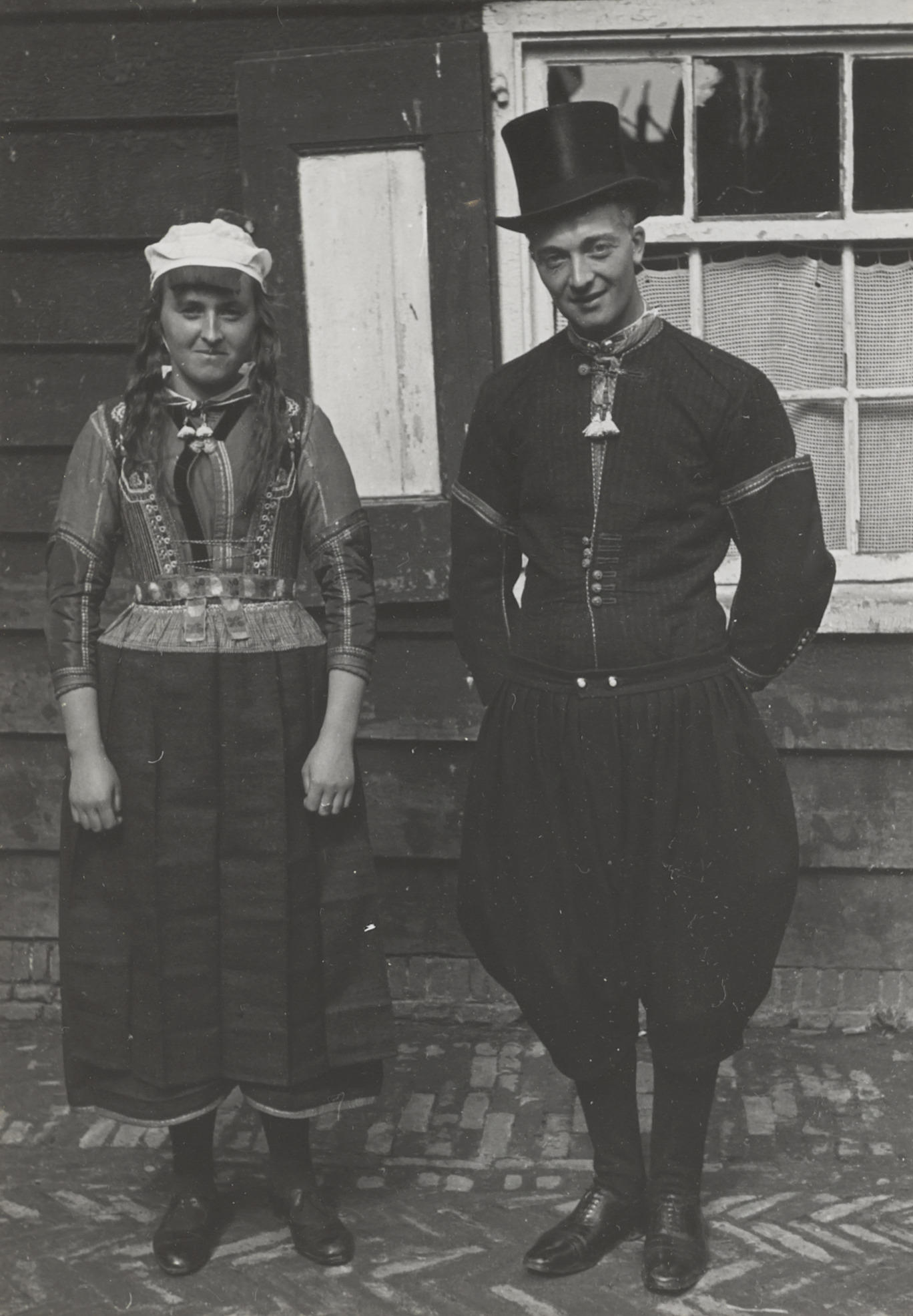 Lobberig Teerhuis en Klaas Zeeman, verkleed in de dracht voor 'Pinkstermaandag' ter gelegenheid van deelname aan een optocht waarbij een Marker bruiloft werd uitgebeeld. Deze optocht vond plaats op vrijdag 31 augustus 1945 vanwege Koninginnedag.